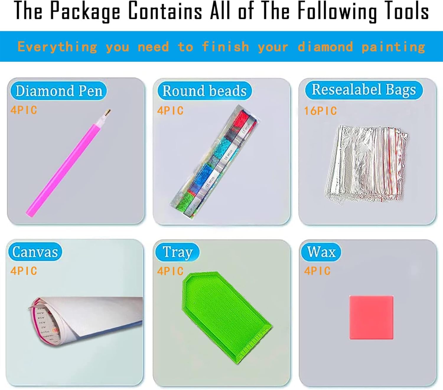 - 【4 Pack Diamond Painting Kits Include】Each 5D diamond painting kits for adults comes with everything needed. Include 4*high definition painting canvas, 4*point diamond pen, 4*cube diamond tray, 4*red glue clay, 16*small ziplock bag, enough colorful round diamonds. We provide an extra 30% beads to ensure that the landscape scenery diamond painting can be completed smoothly. Spend less money get more diamond painting kits.