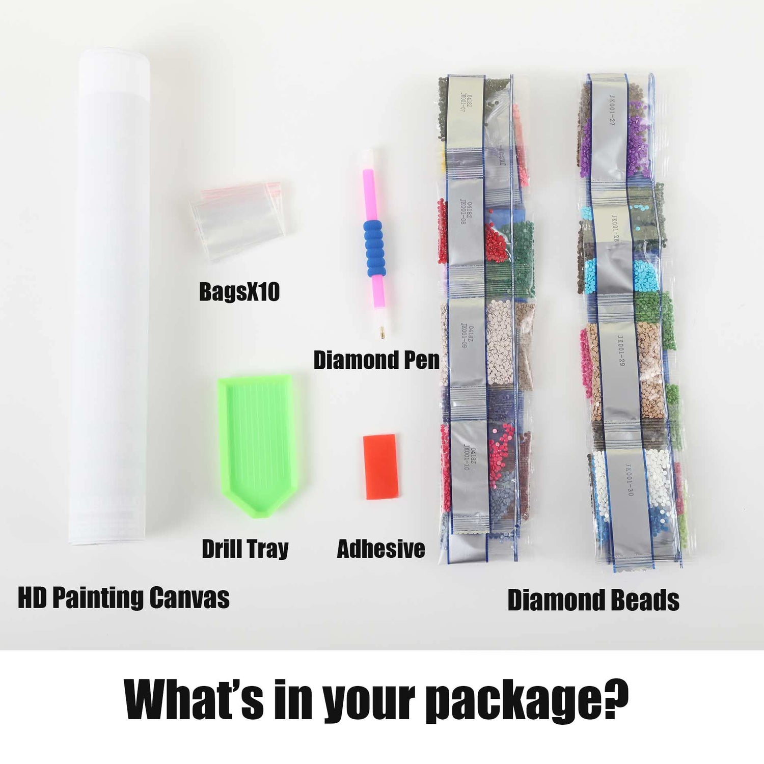 - 【Diamond Painting Kit】:Adult diamond painting kits accessories & tools come with everything you need! Includes 1 canvas for painting, 1 tray, 1 wax, 10 ziplock bags, 1 pointed diamond pen, 1 pen sleeve and enough diamond art beads.