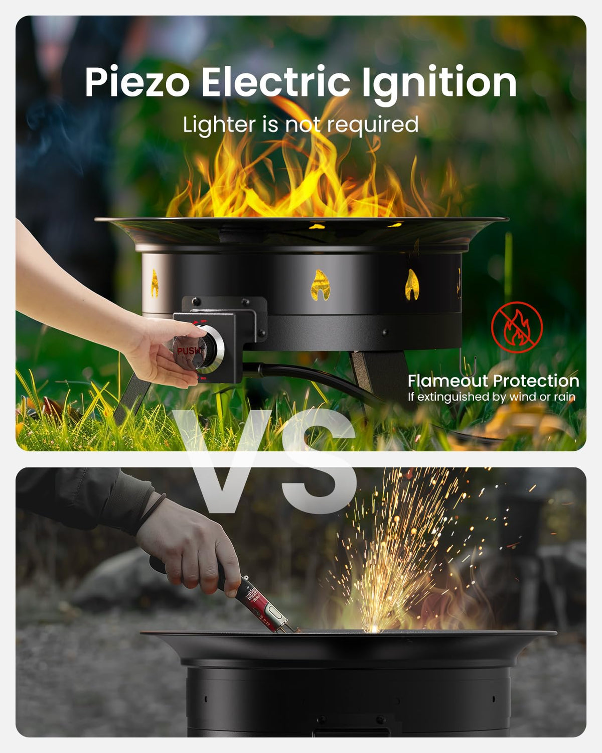 - Piezo Electric Ignition: Piezo ignition is more secure and reliable with no batteries or external power required. Simply push and hold the electroplated knob for 3 seconds, then turn to MAX and hold for 5 seconds. The propane fire pit is designed to light reliably every time.
