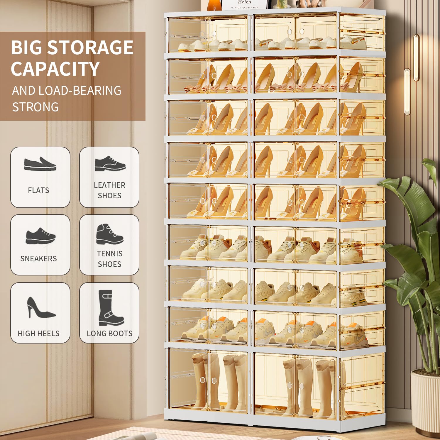CIMLORD 9 Tier Foldable Shoe Rack for Closet Entryway 18-36 Pairs Stackable Clear Shoe Storage Boxes with Lids Large Shoes Shelf with Door Tall Plastic Organizer Cabinet Easy Assembly