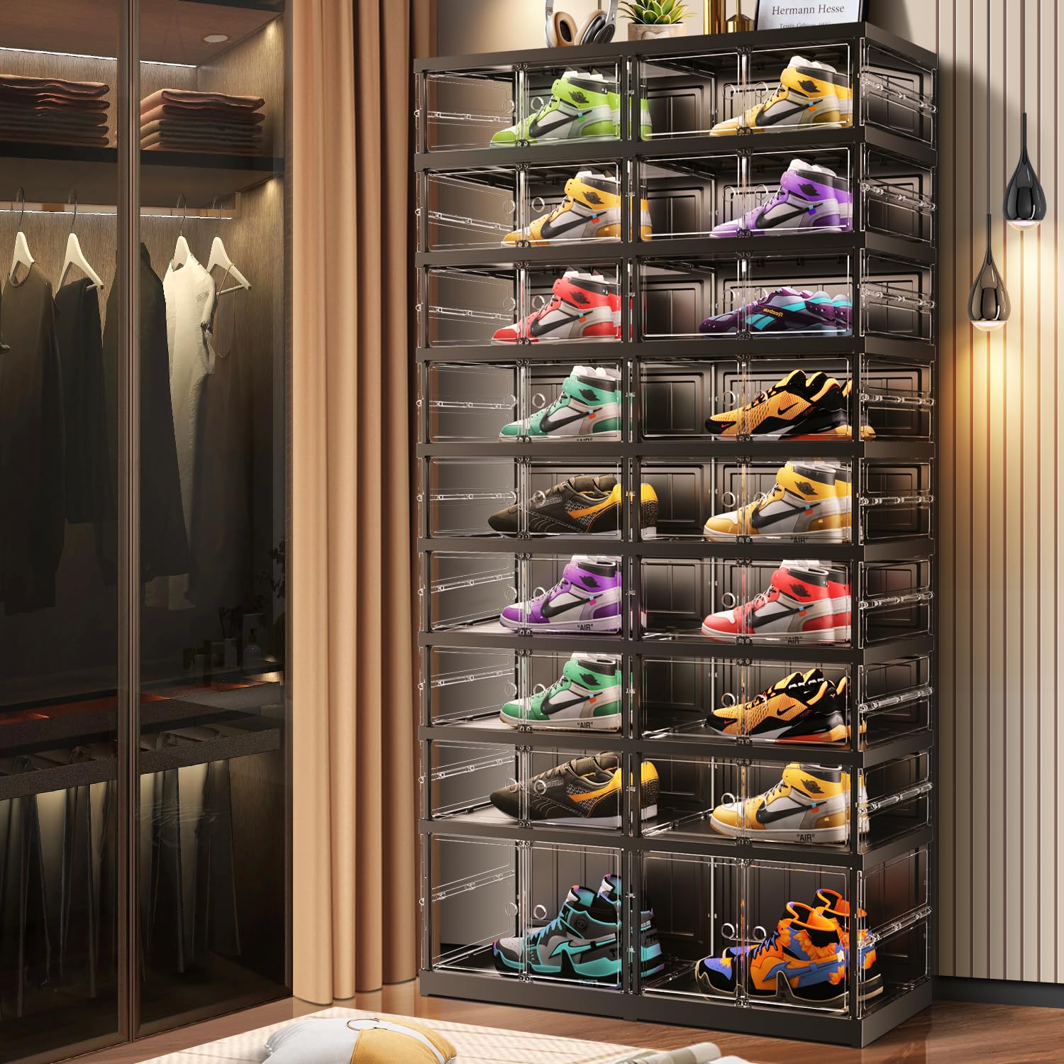 - Quick Installation: Collapsible plastic shoe boxes with lids is use integrated structure design, without any assembly tools.You can put it on the floor and pull it open like an accordion, that you can get a new foldable shoe box. Clear shoe boxes organizers your shoes with a minimal and modern style that blends with your room decor. Even a small space in the corner of the room will become elegant