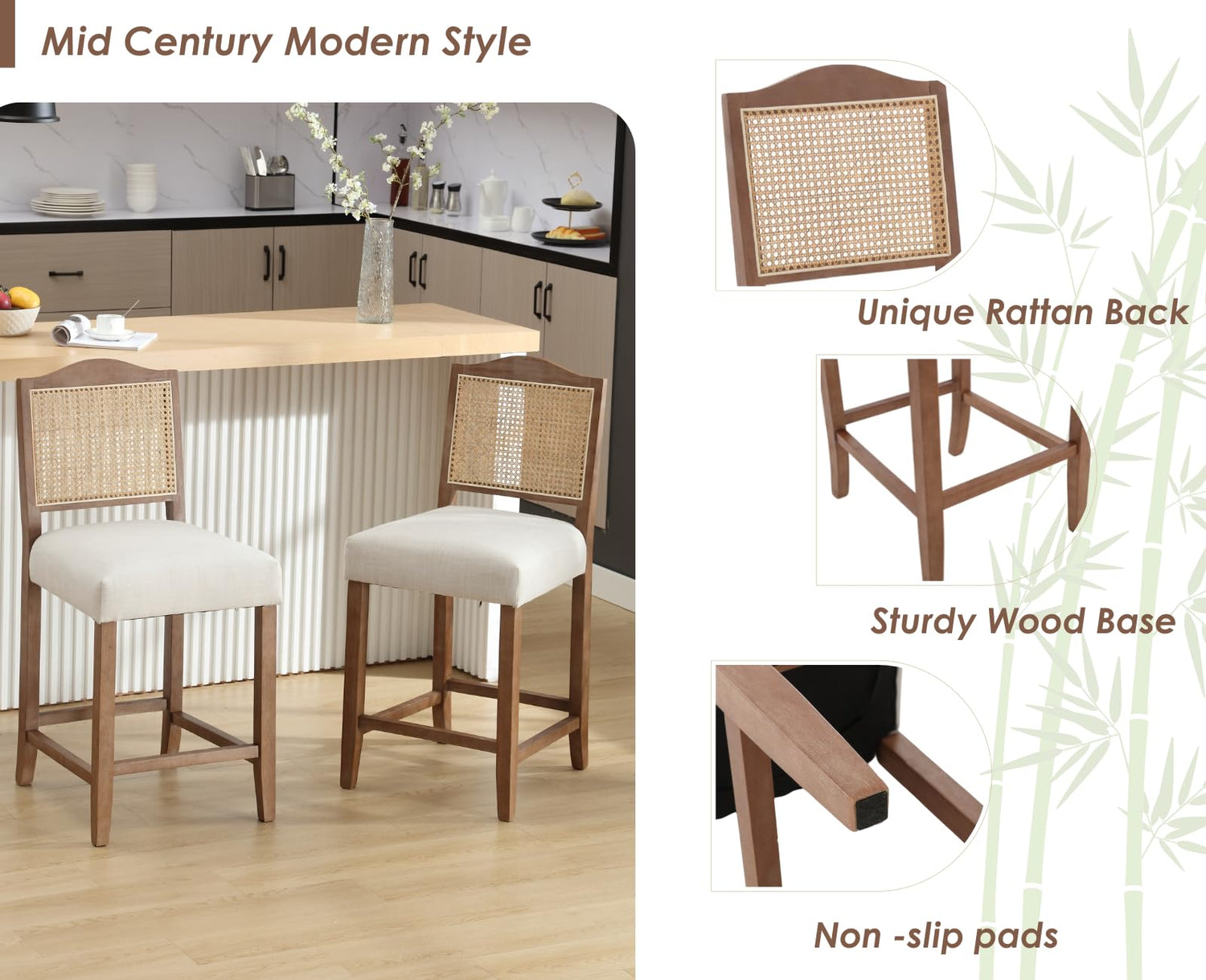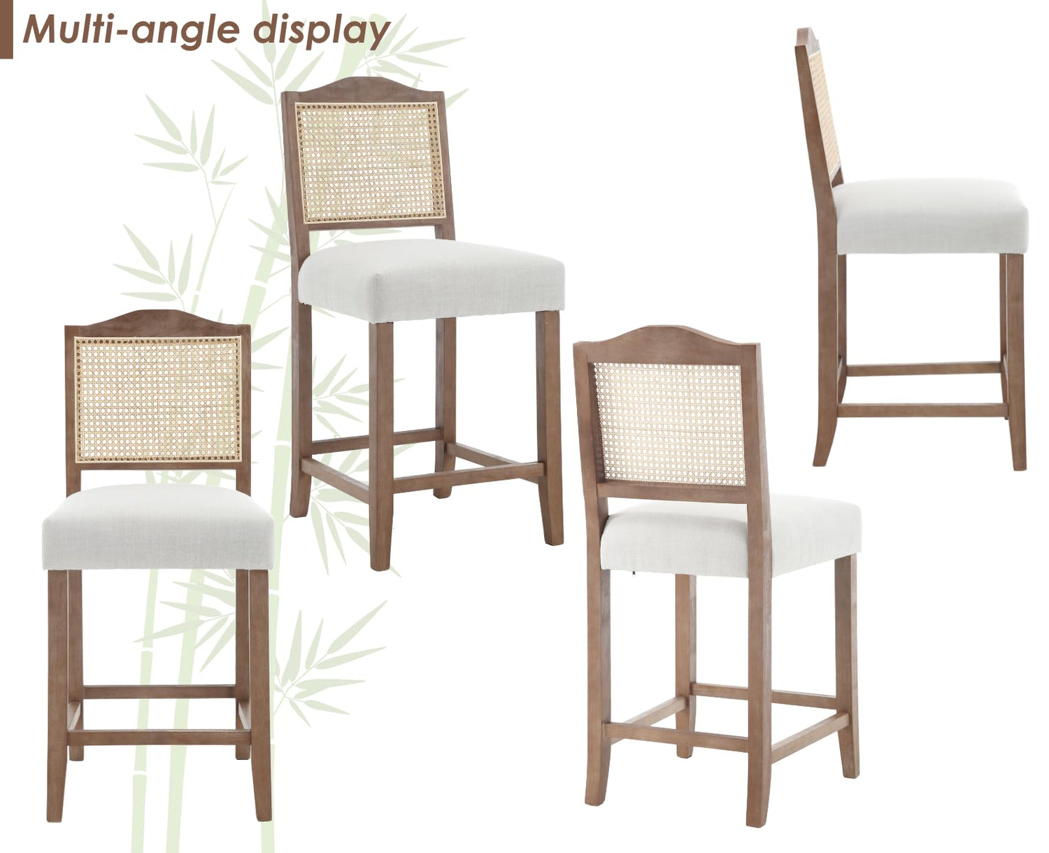 CIMOTA Counter Height Bar Stools Set of 4 Rattan Farmhouse Barstools Mid Century Modern Bar Chairs Upholstered Kitchen Stools with Wood Legs for Island/Dining Room, Linen Beige 26.5In