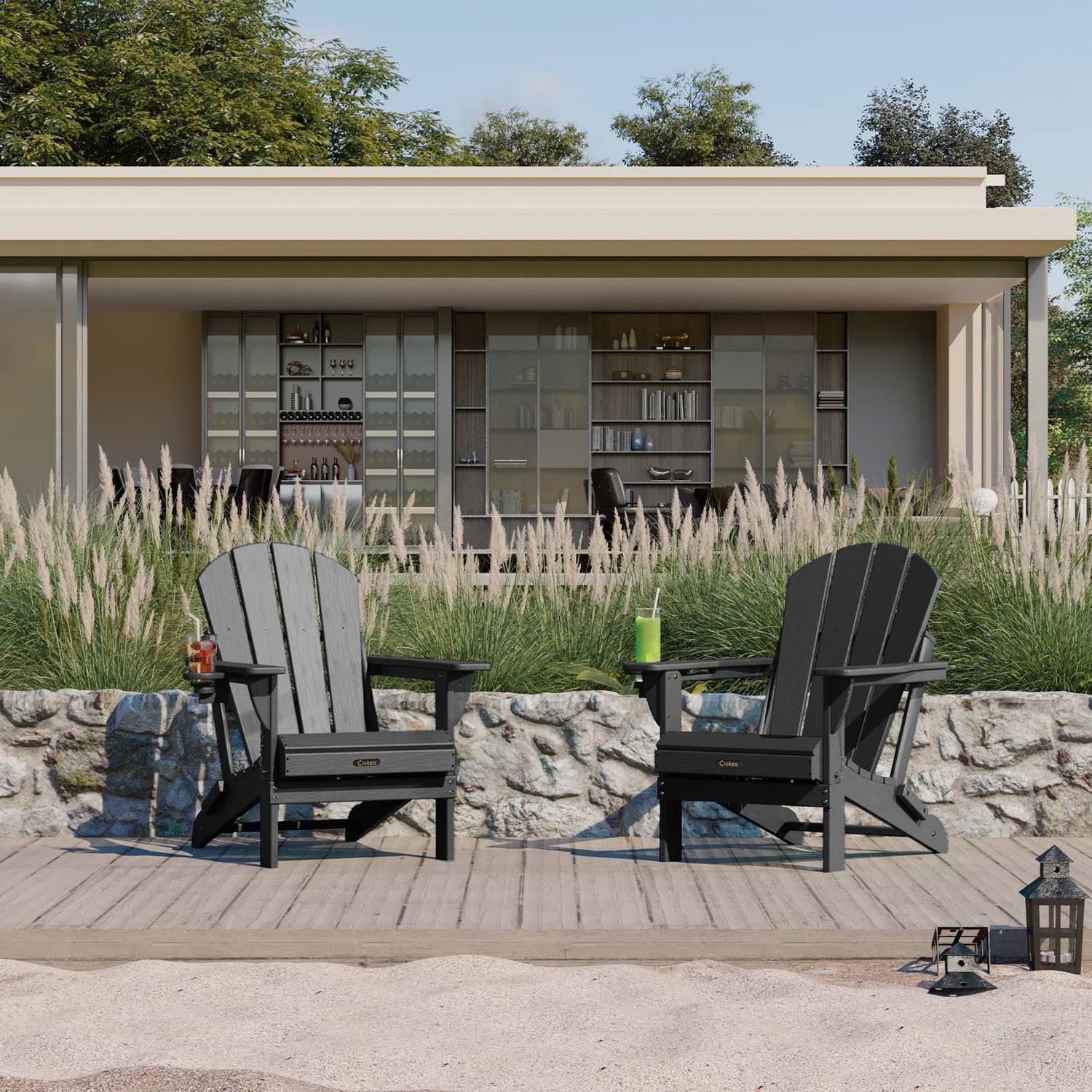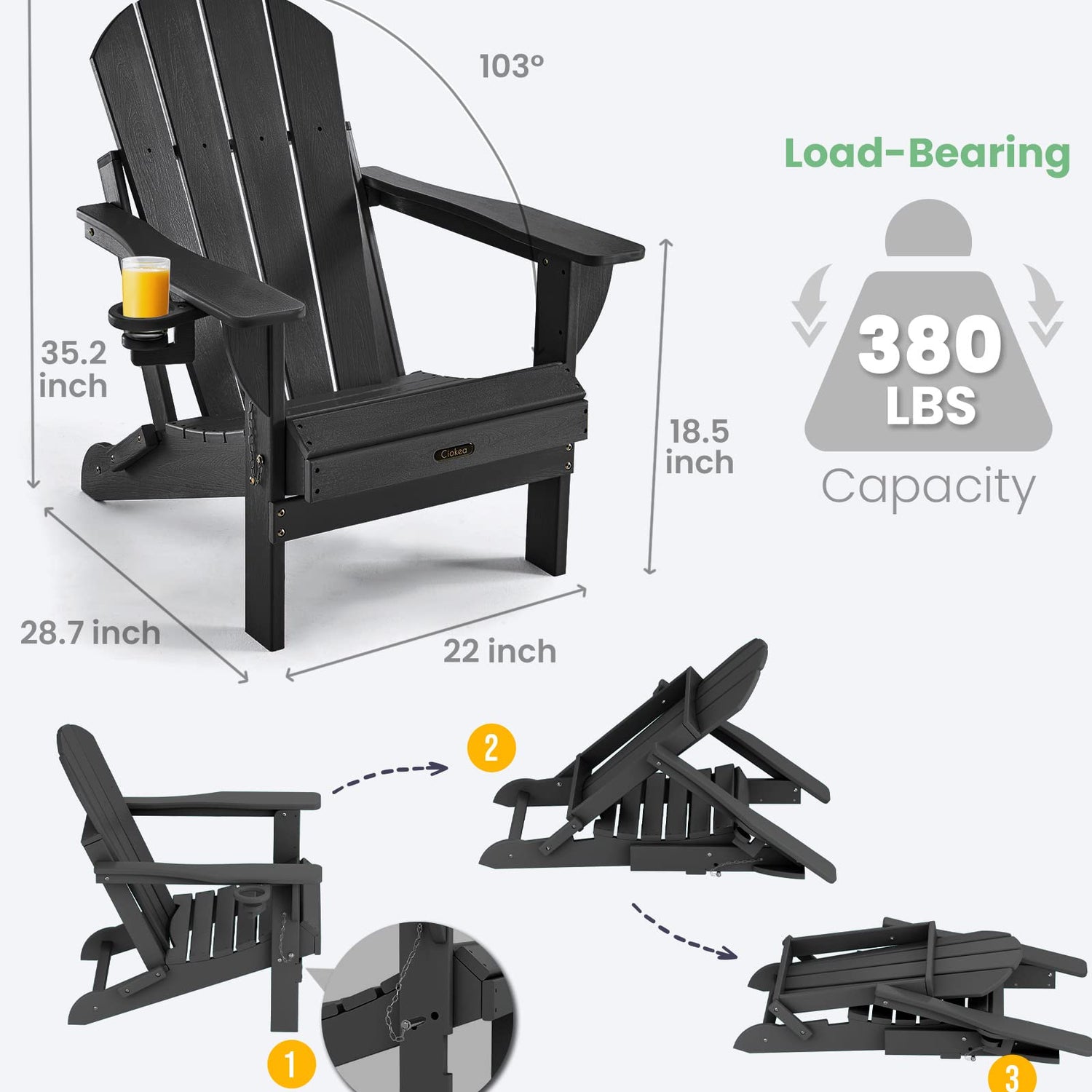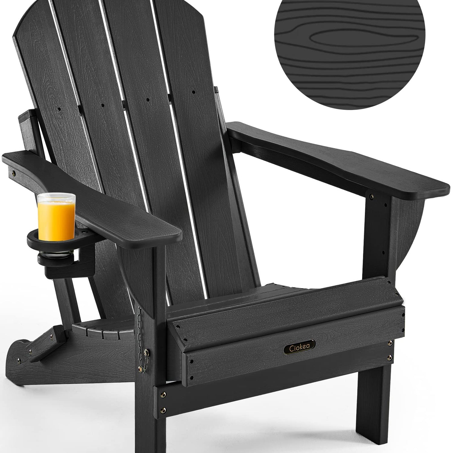 Ciokea Folding Adirondack Chair Wood Texture for Patio, Weather Resistant, Plastic Fire Pit Chair with Cup Holder, Lawn Chair for Outdoor Porch Garden Backyard Deck (Black)