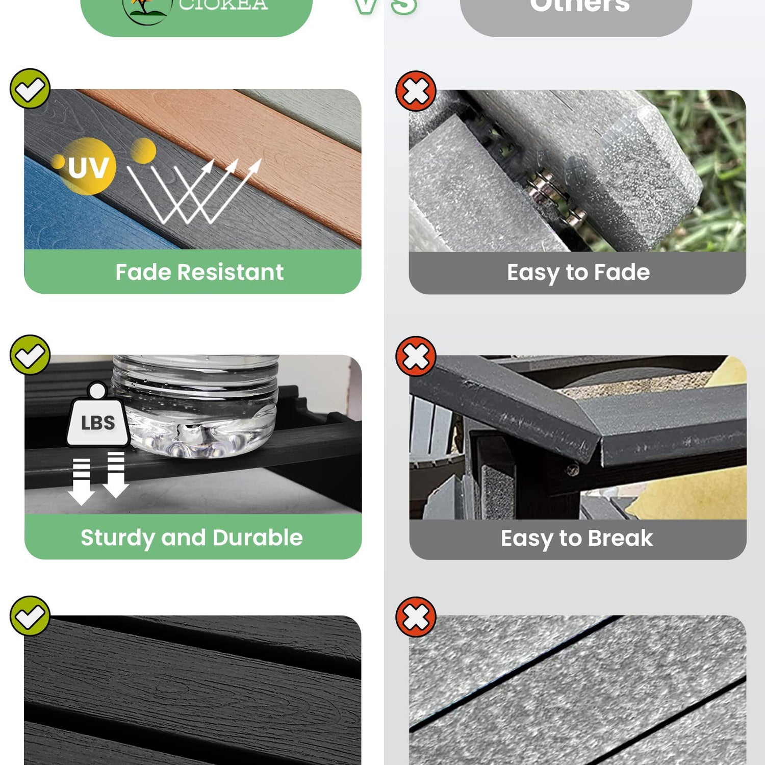 - Sturdy & Durable: Crafted from premium wood garin HDPE material, our plastic Adirondack chairs offer exceptional resilience. The CIOKEA HDPE plate minimizes bending under impact and recovers its shape, outperforming ordinary plates. With a load capacity of 380LBS, these chairs are built to last