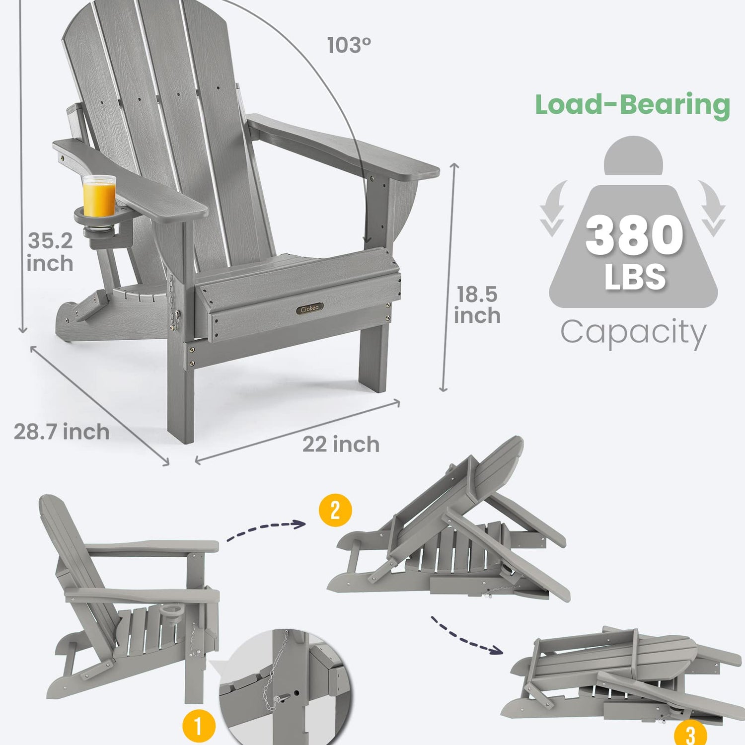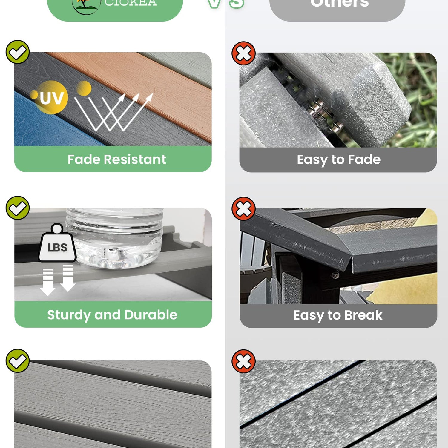 - Sturdy & Durable: Crafted from premium wood garin HDPE material, our plastic Adirondack chairs offer exceptional resilience. The CIOKEA HDPE plate minimizes bending under impact and recovers its shape, outperforming ordinary plates. With a load capacity of 380LBS, these chairs are built to last.