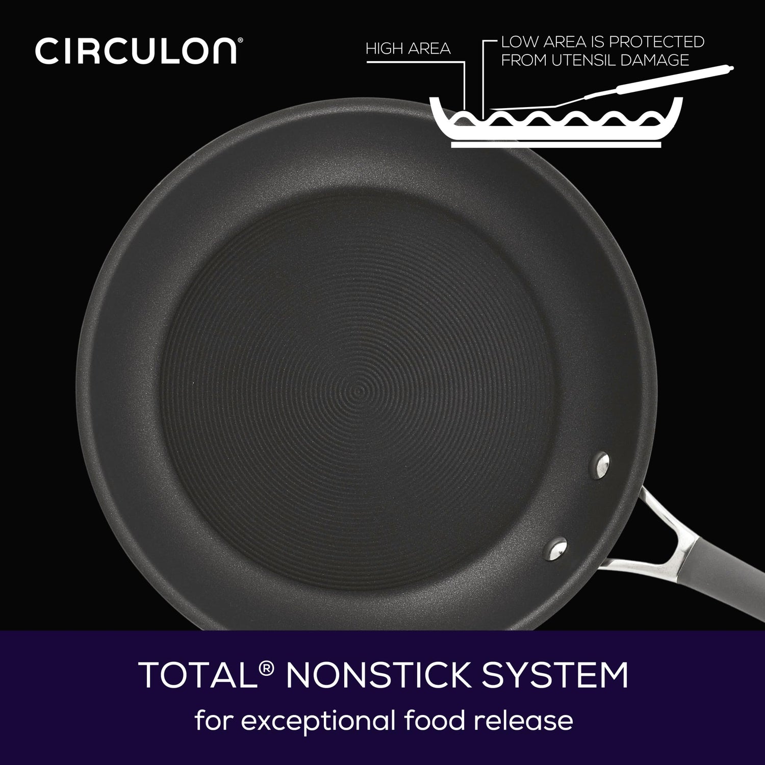 Details: Energize the kitchen for cooking performance and dishwasher-safe convenience using this versatile and efficient Circulon® Radiance™ Hard-Anodized Nonstick 10-Piece Cookware Set. Engineered with superior nonstick technology and time- and energy-saving dishwasher-safe convenience, these heavy-gauge hard-anodized pots and pans deliver balanced heating for every cooking technique, from a quick weekend lunch for the kids to a slowly simmered, succulent one-pot stew. Sturdy, double-riveted cookware handles provide a confident hold, and tempered glass lids seal in heat and flavor while you watch foods cook. Pots and pans feature the TOTAL® Nonstick System of raised circles and premium nonstick for natural food release and easy cleanup that lasts 10 times longer than normal nonsticks. From the saucepans to skillets, sauté to stockpot, every cookware piece delivers effortless food release and resistance to scratching, staining, and chipping. Best of all, Radiance cookware is dishwasher safe for the ultimate in convenient cleanup. Oven safe to 400°F and compatible with all stovetops except induction.