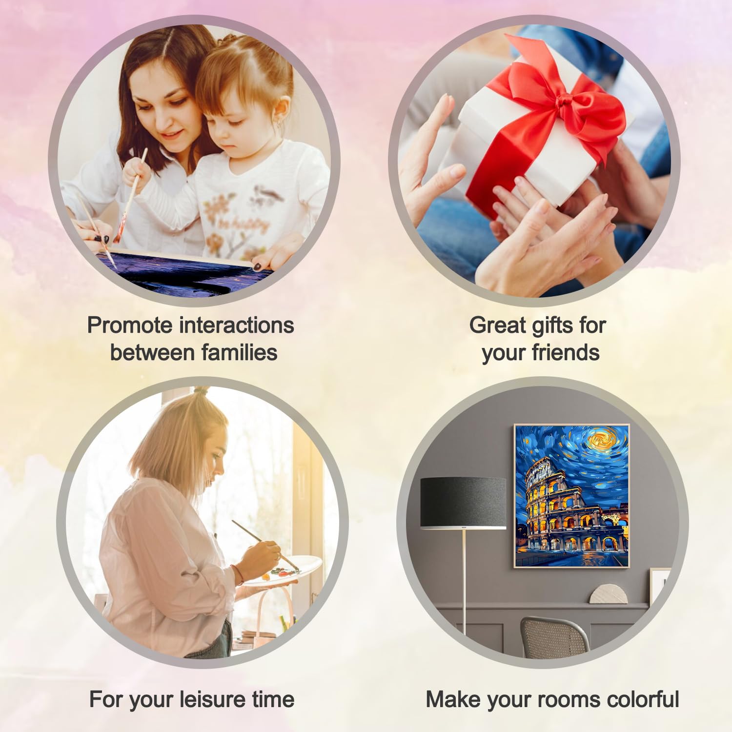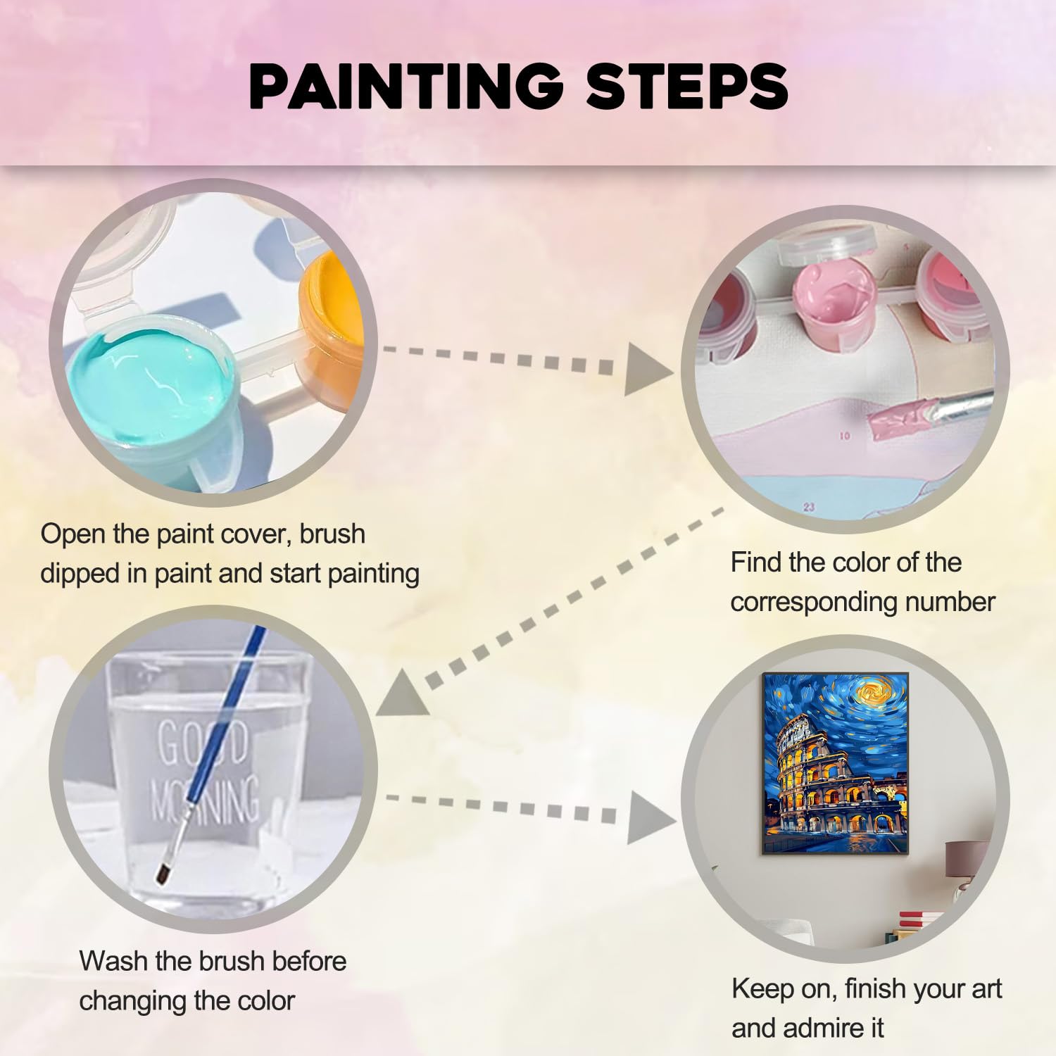 - Benefits of Paint by Number Adults:DIY paint by numbers for adults can experience a sense of achievement.By matching the pigments with the numbers on the canvas and filling the corresponding colors into the numbered areas,you can easily create a amazing work and gain the inner peace to reduce stress during the process.We believe you will definitely love your this paint when this Rome paint by number canvas for adults is finished.
