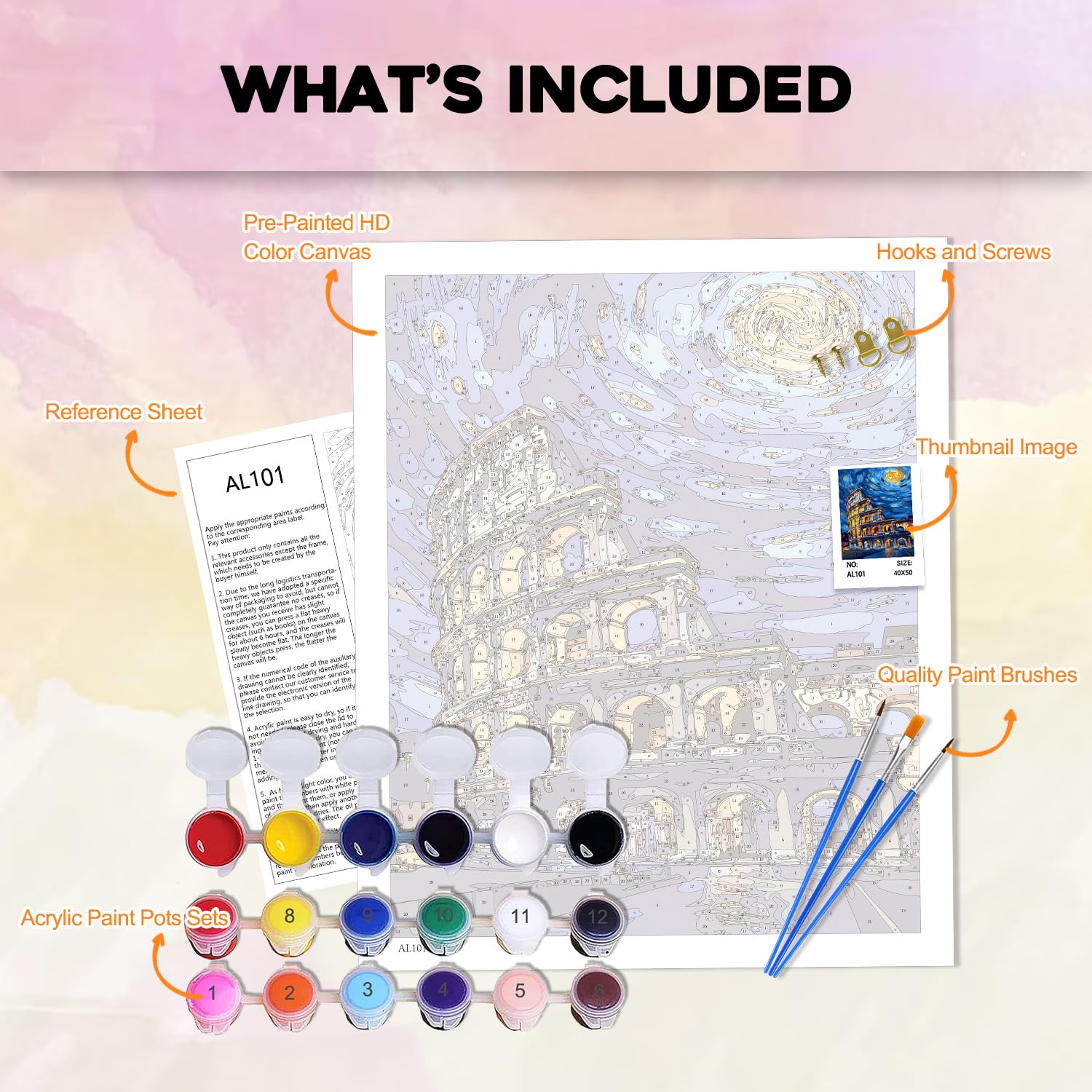 - Rome Canvas Paint by Numbers for Adults:Our Paint by the Numbers for Adults Kit which is a high-density waterproof for ensuring the uniformity of the canvas texture.Numbers on the canvas are clear and easy to read.The acrylic paints are full of shinning colours and fade-free when dry.The digital oil painting will last for years after completed.