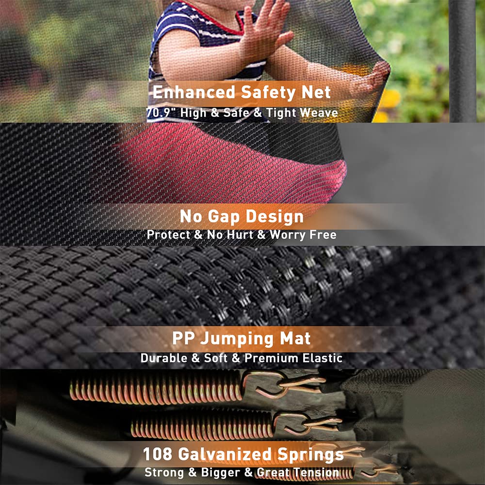 - 【Superior Bounce Experience】108 rust-resistant galvanized trampoline springs securely attach the tightly woven jumping mat and frame together, offering superior and impressive bounce. The jumping mat is made of PP material with premium elasticity-back property allowing kids to jump higher and merrier.
