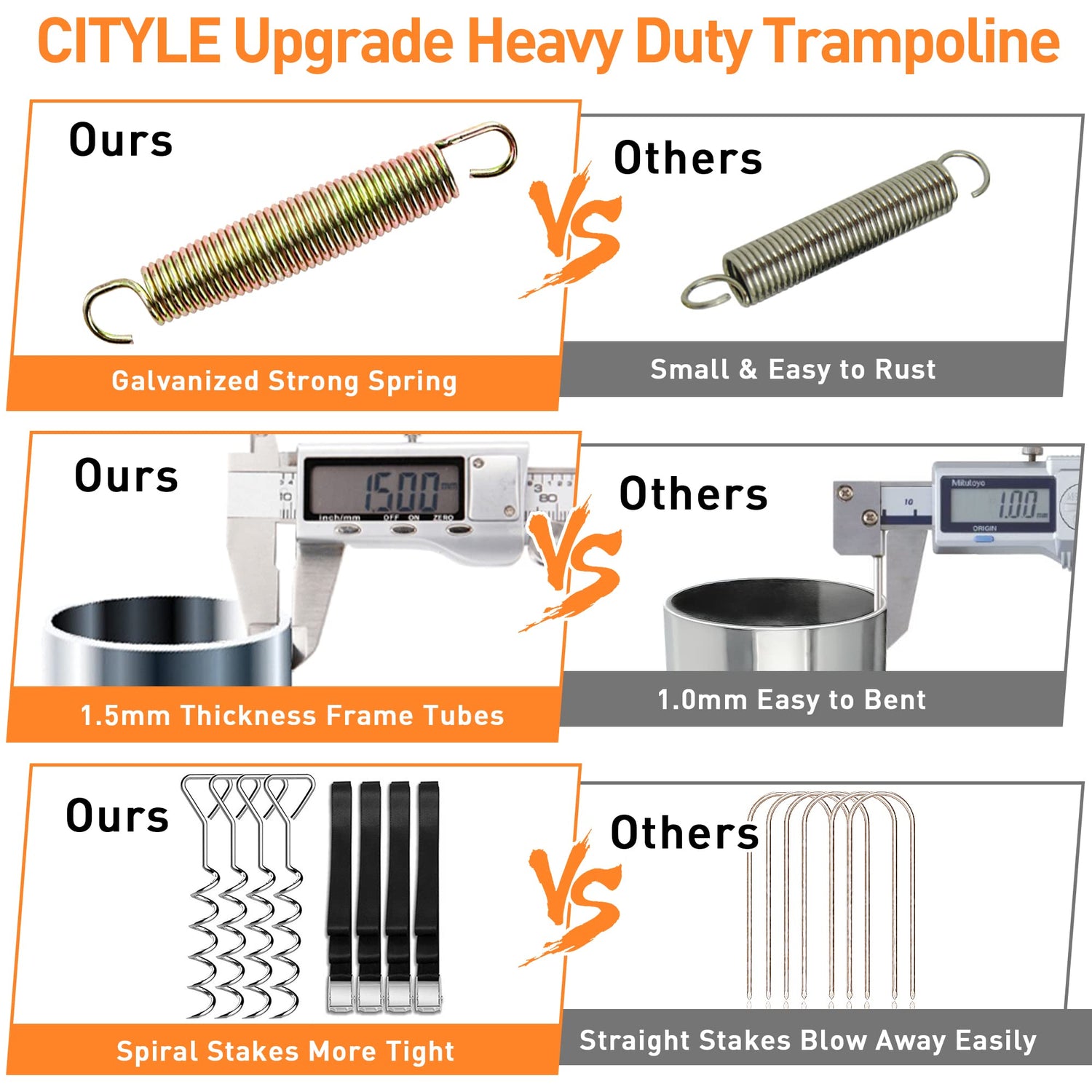 - 【Safety First】16 FT Trampoline is equipt with 12 high safety enclosure poles and heavy gauge galvanized rust resistance steel construction. 6 W-shaped legs secure stability. We have comprehensive testing of the chemical composition of the material and the structure design of the product to ensure its safety.