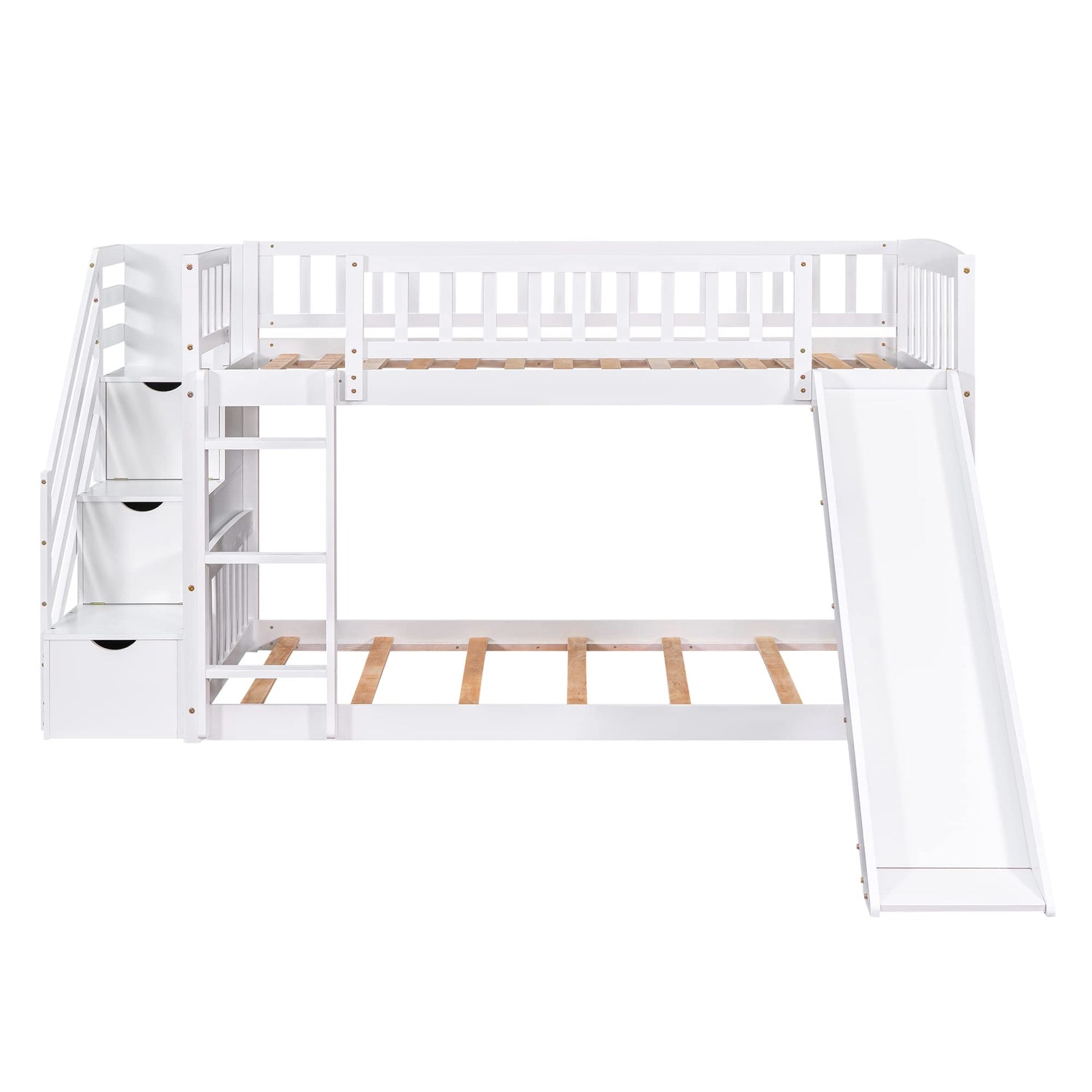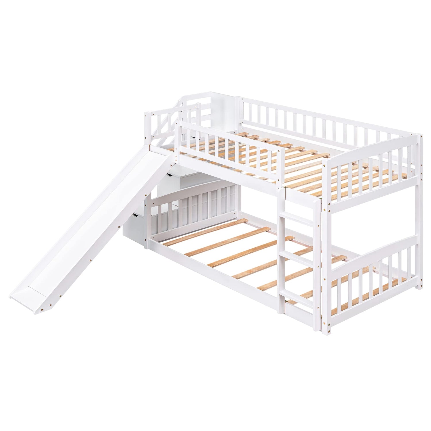 CITYLIGHT Kids Bunk Bed with Slide and Stairs, Twin Over Twin Bunk Bed with 3 Drawers, Floor Bunk Bed for Kids, Wooden Bunk Bed Frame, White