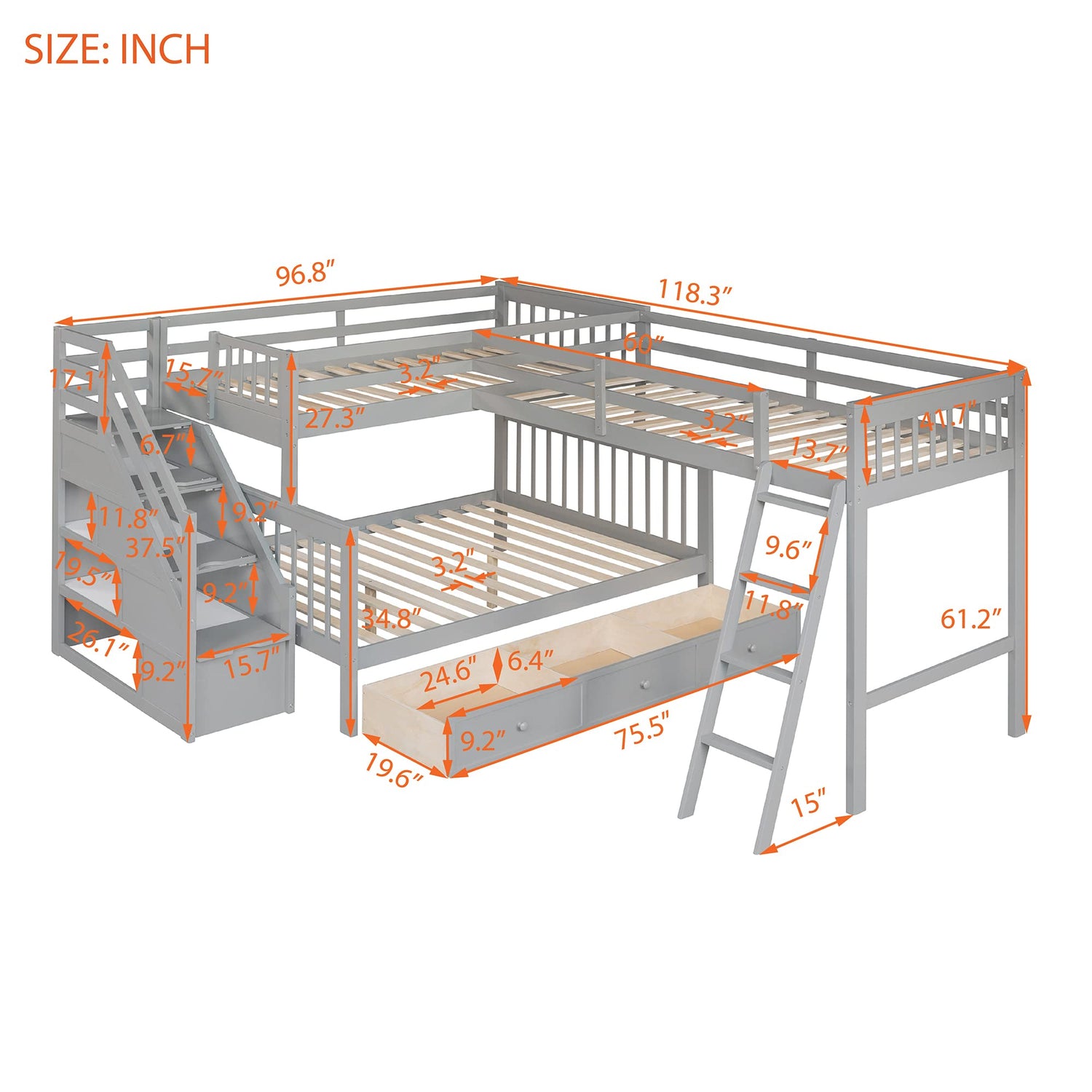 - 【Overall Bunk Bed Dimension】118.3"L x 96.8"W x 61.2"H. Mattress not included. Some assembly is required, although we have provided clear instructions and tools. kindly note that L-Shaped bunk bed with storage come in 3 boxes which maybe arrived on different date ,please wait patiently or contact us if you have any questions .