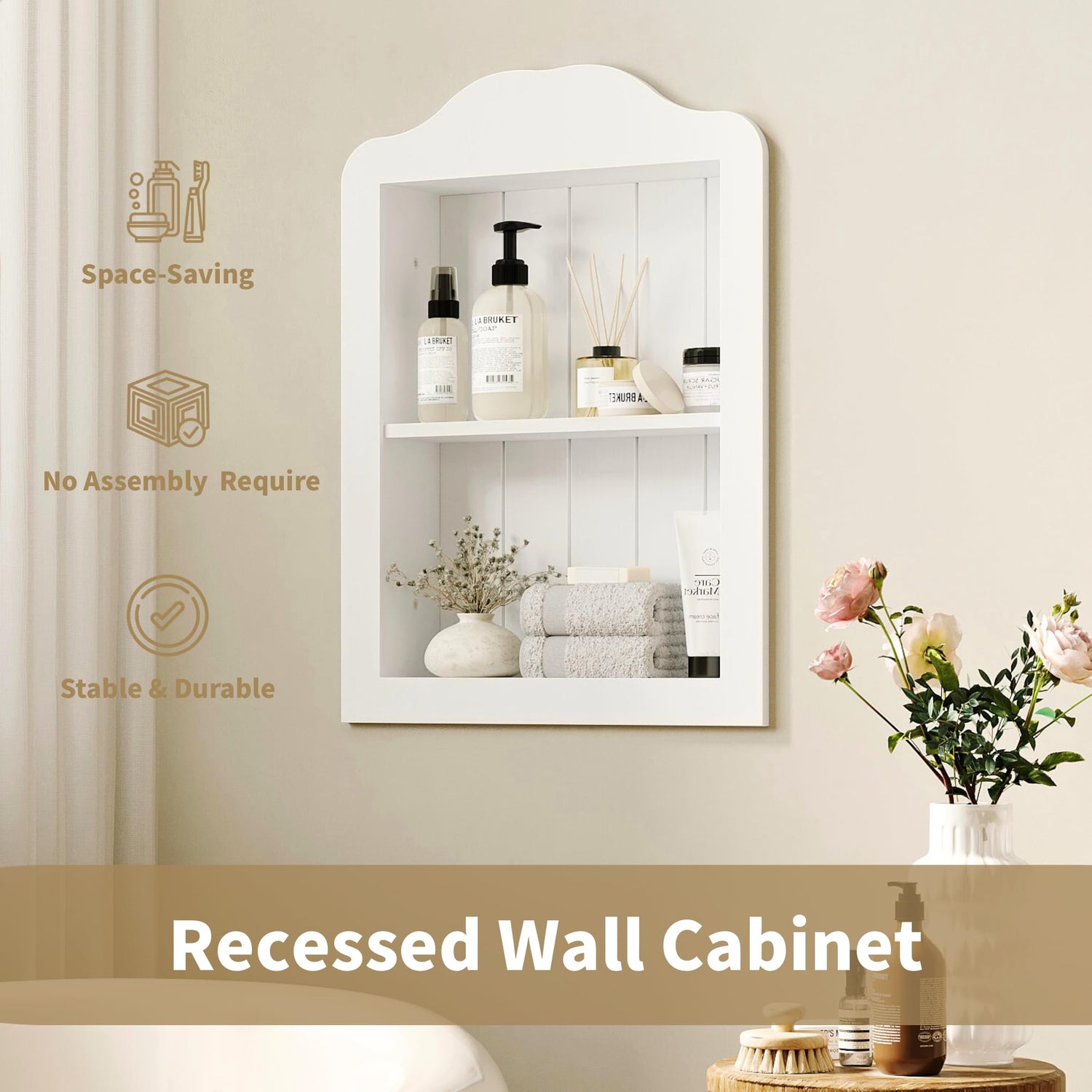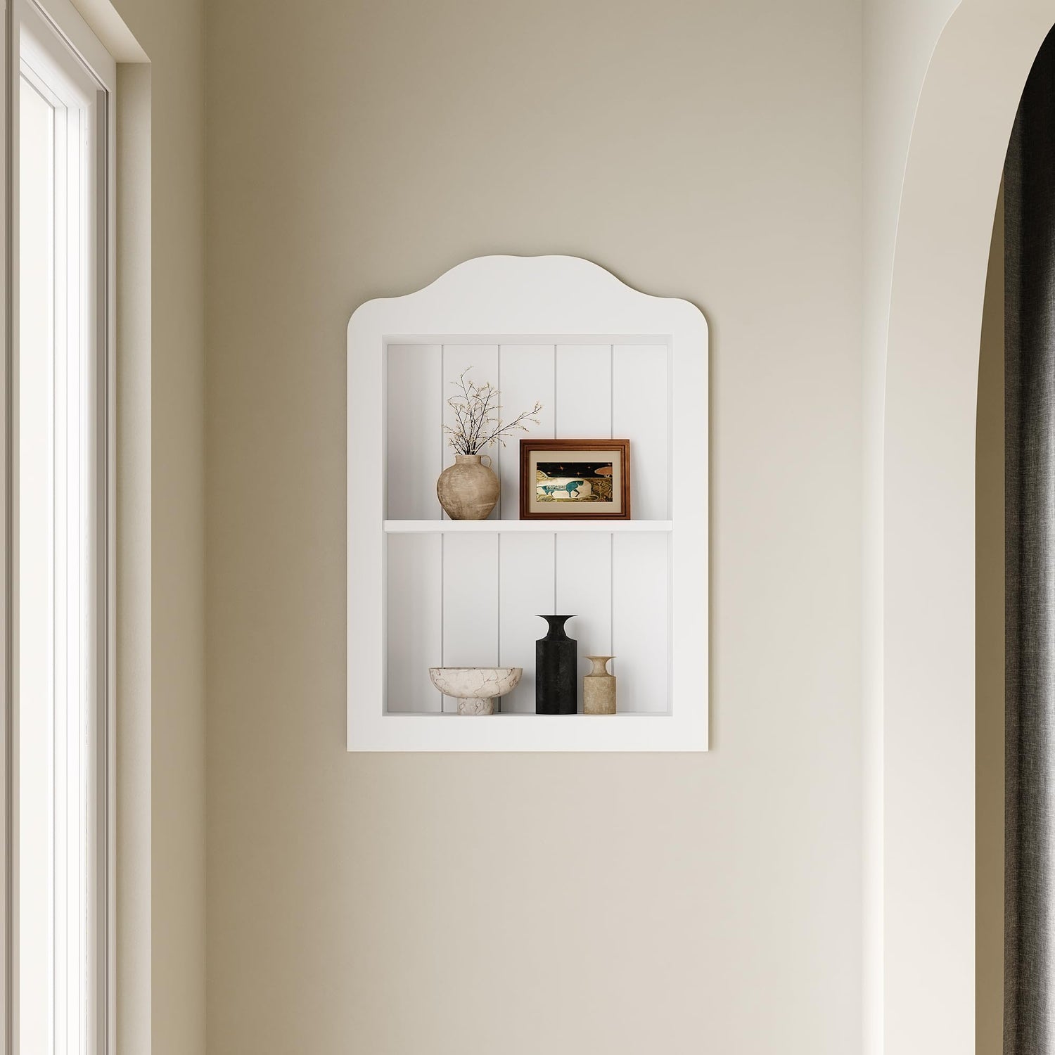 - Elegant Arched Bathroom Cabinet Design: Featuring a graceful arched top and smooth finish in white, this wall cabinet blends seamlessly with modern, farmhouse, or traditional interiors—adding both storage and decorative appeal to your wall niche.
