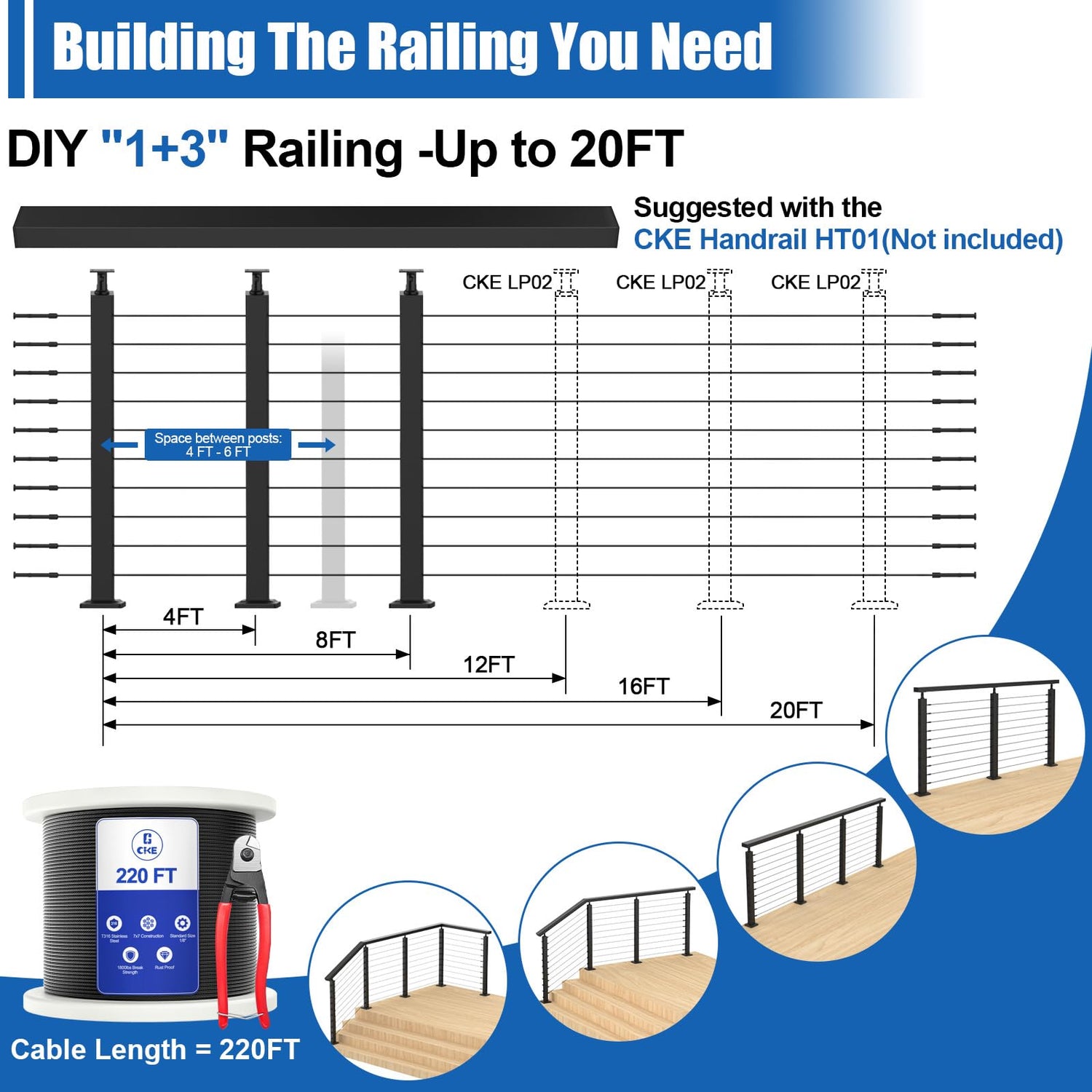 - 【Swageless Complete Modular Kit】CKE 10-15ft Modular 36" Cable Railing Post Kit contains 3 pcs level drilled black cable railing posts, 20 pcs swageless invisible cable railing kit, 220 Feet T316 stainless steel wire rope with cable cutter, 75 pcs cable railing rubber grommets and installation guides. 220 Feet enough cable length can easily expand with additional black posts or handrails (sold separately, search CKE HT01) for seamless transitions across stairs, landings, or corners.