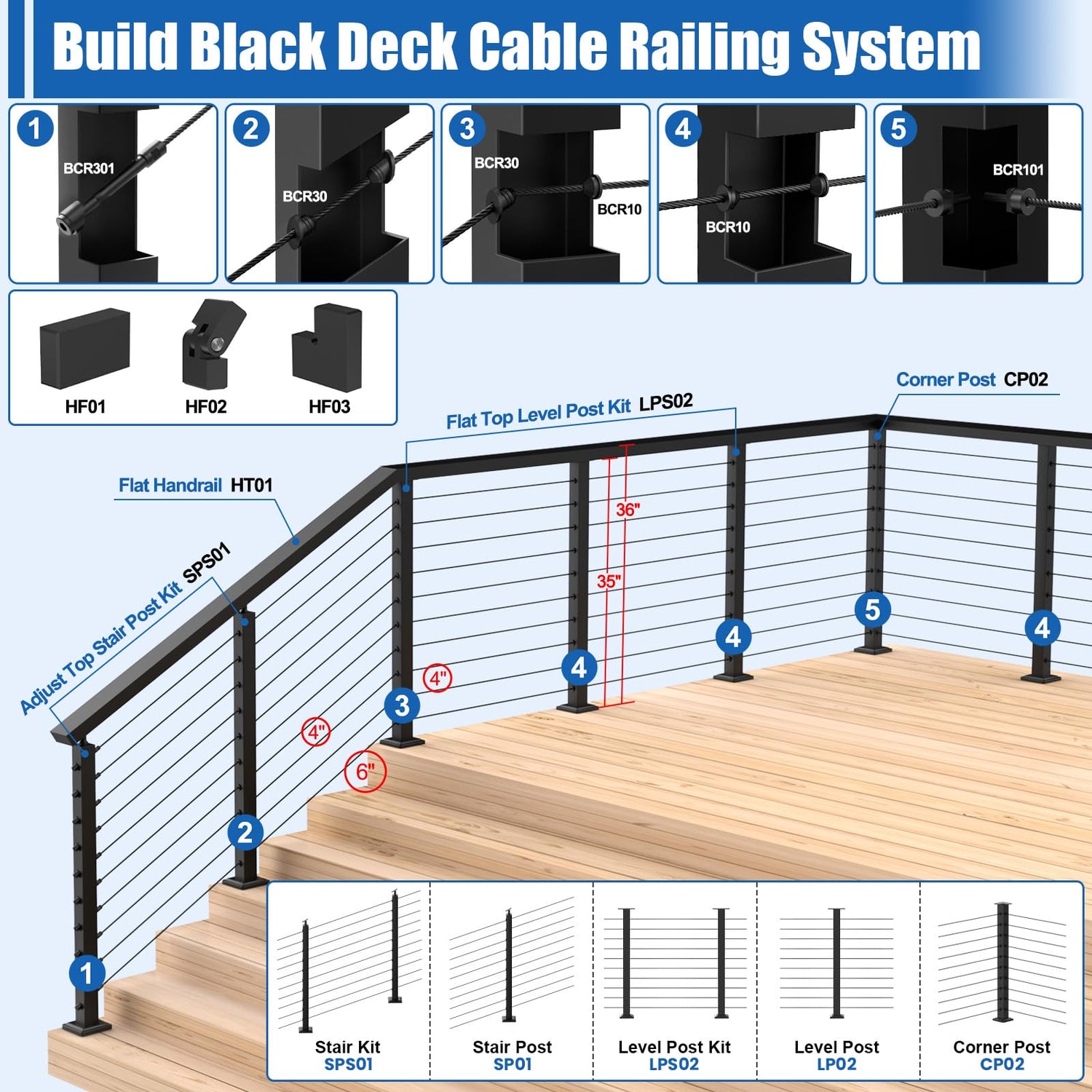 - 【Expand Options & Customization】Build black deck cable railing post kit system maximizing cost efficiency with expand options: Level Posts-CKE LP01/LP02, Stair Post-CKE SP01, Corner Post-CKE CP01/CP02, 36" and 42" sizes black cable railing post and complete railing post kits set are available to choose. Cable Post Flat Handrail-CKE HT01/HT02. If you need a complete personalized solution, please contact us for free professional and customization design before-sales or after-sales service.