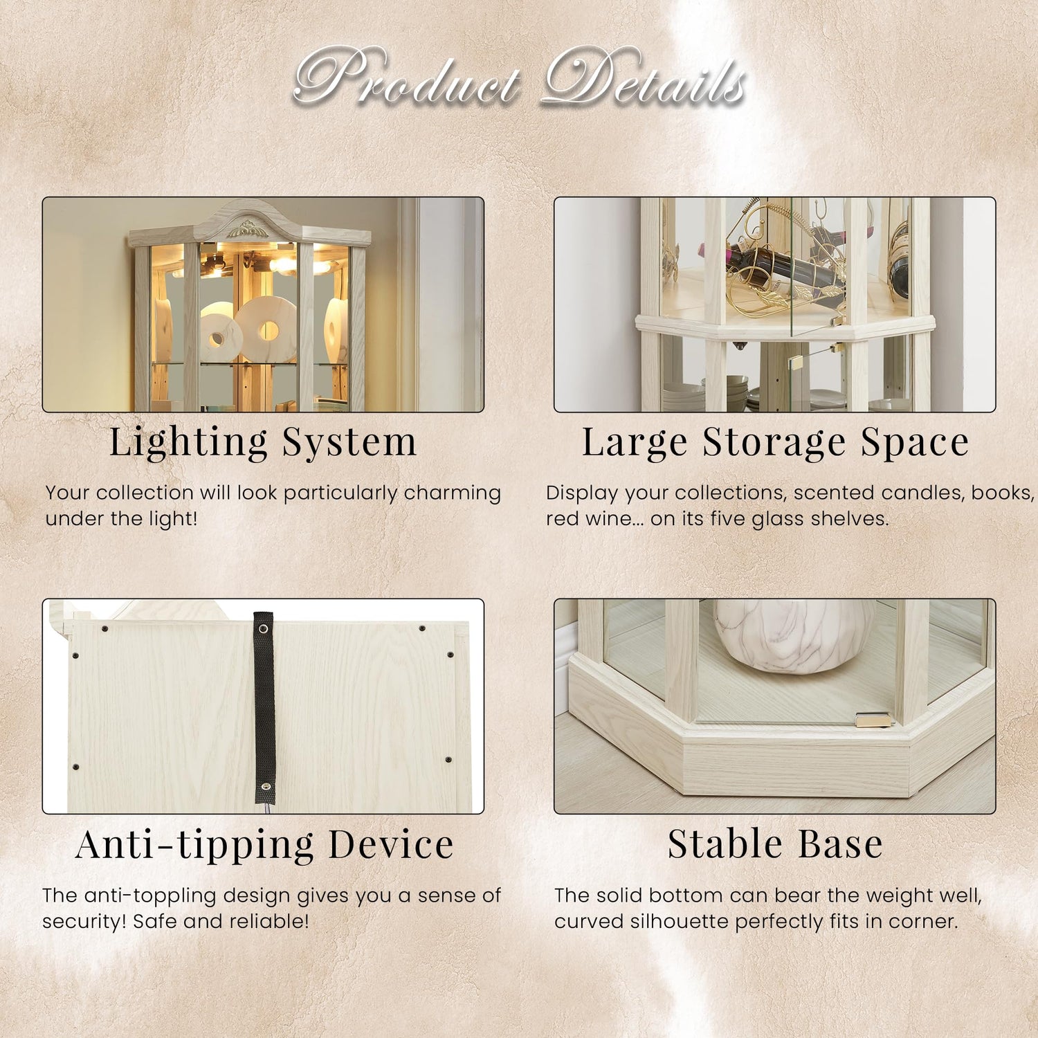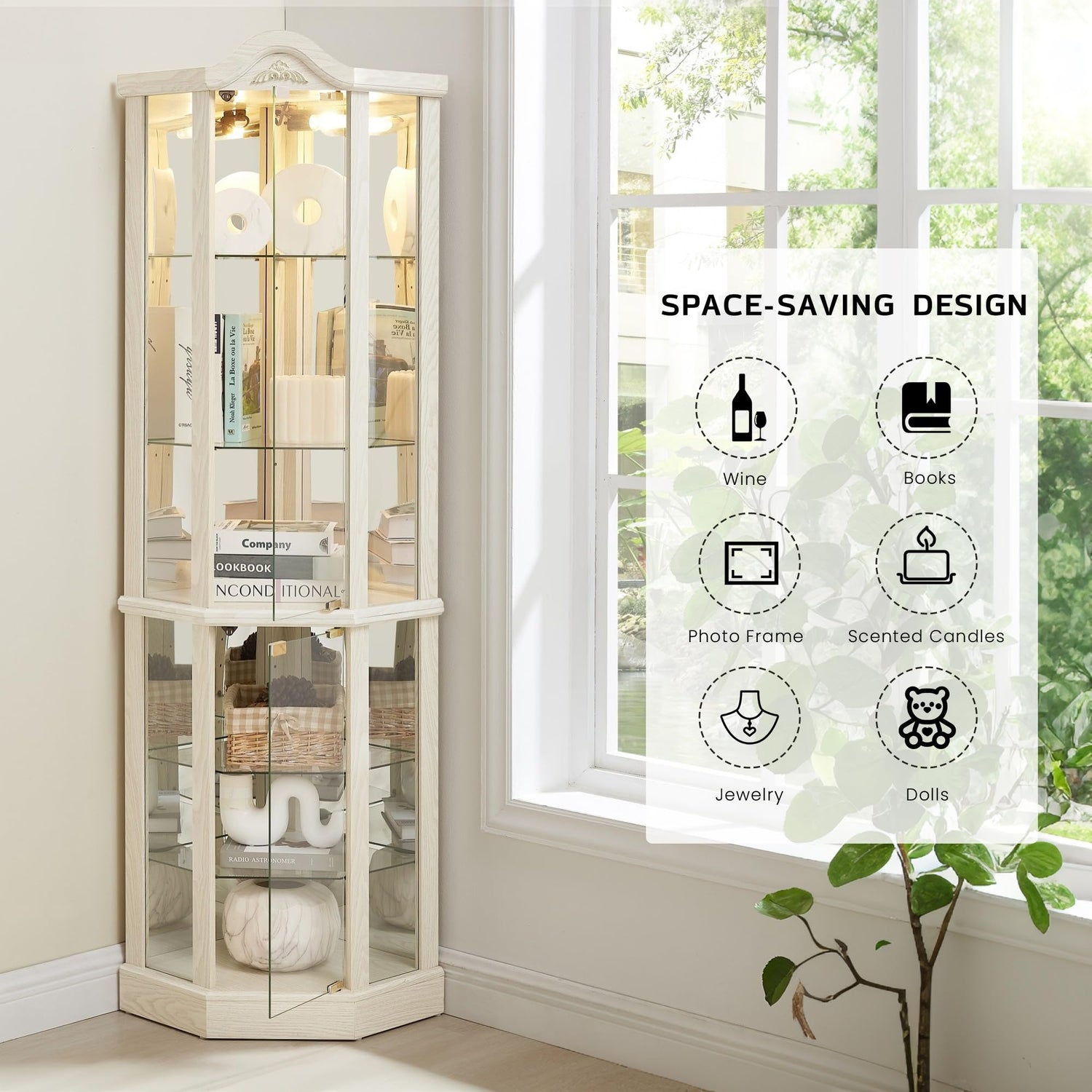 - [Space-Saving Corner Design for Any Home] Designed to fit snugly into tight spaces, this 72-inch corner curio cabinet maximizes storage without sacrificing style. Its glass doors and lights provide a clutter-free, gallery-like showcase—perfect for small apartments, cozy homes, or collectors seeking a curio cabinets with glass doors and lights.