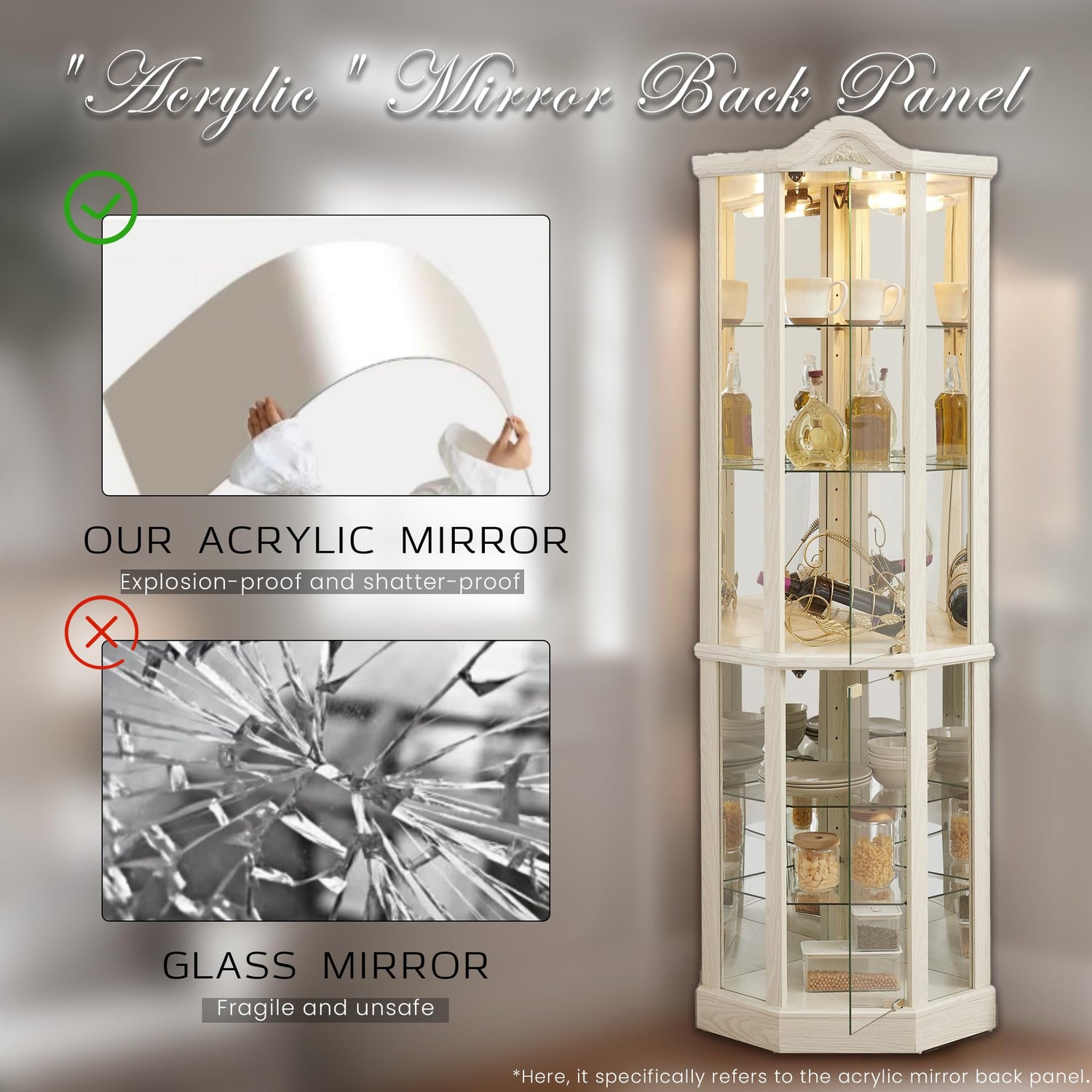 - [Elegant Display with Built-In Lighting] Featuring 2 glass-pane doors, 4 glass side panels, and adjustable shelves, this corner china cabinet offers a spacious, well-lit showcase. The built-in light and mirrored back panels enhance visibility, creating a museum-like display for your wine bottles, books, or family treasures—ideal for any curio corner cabinet.