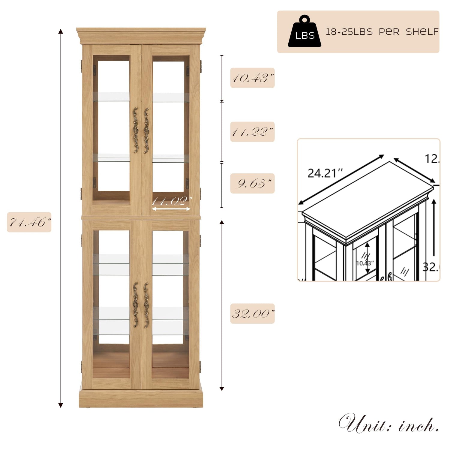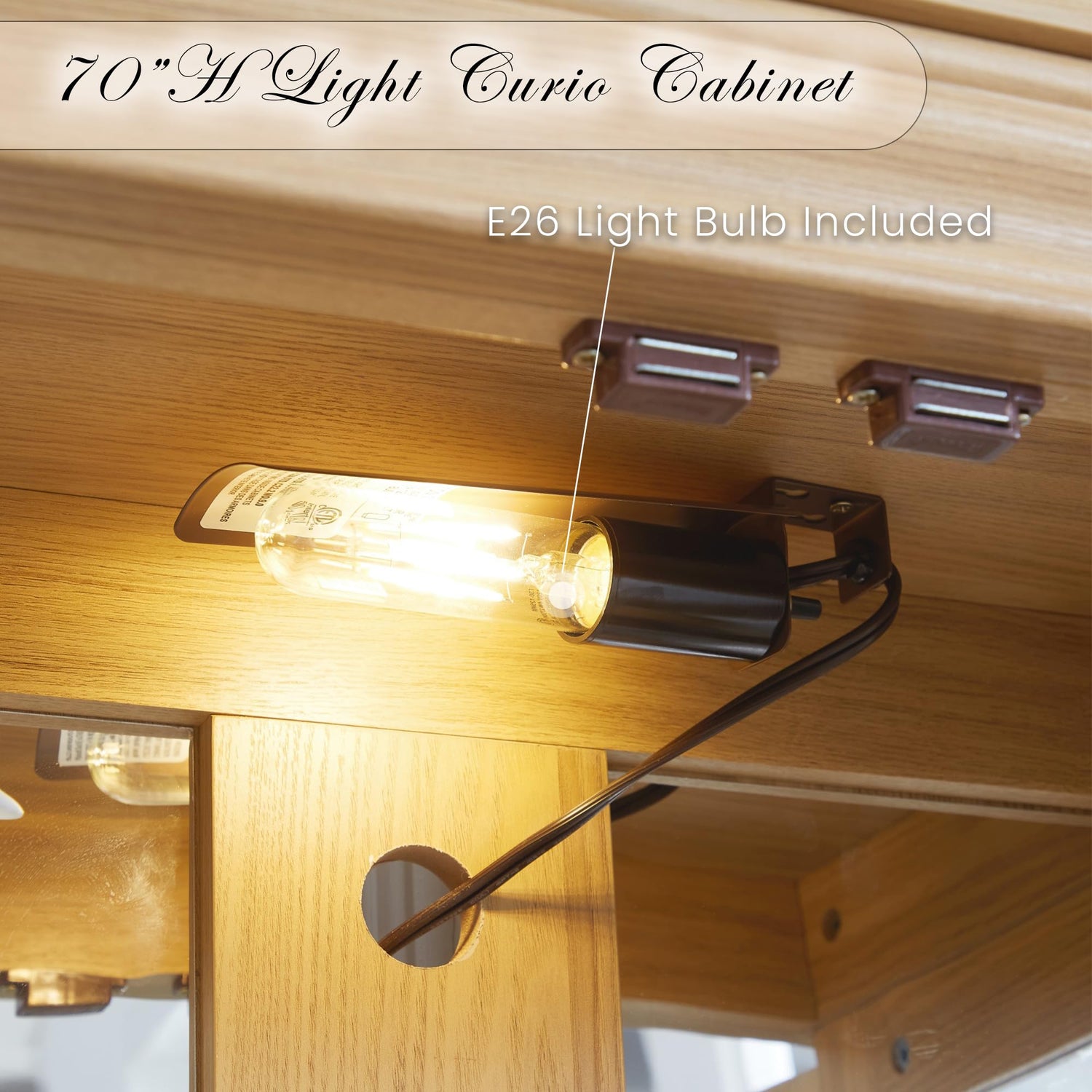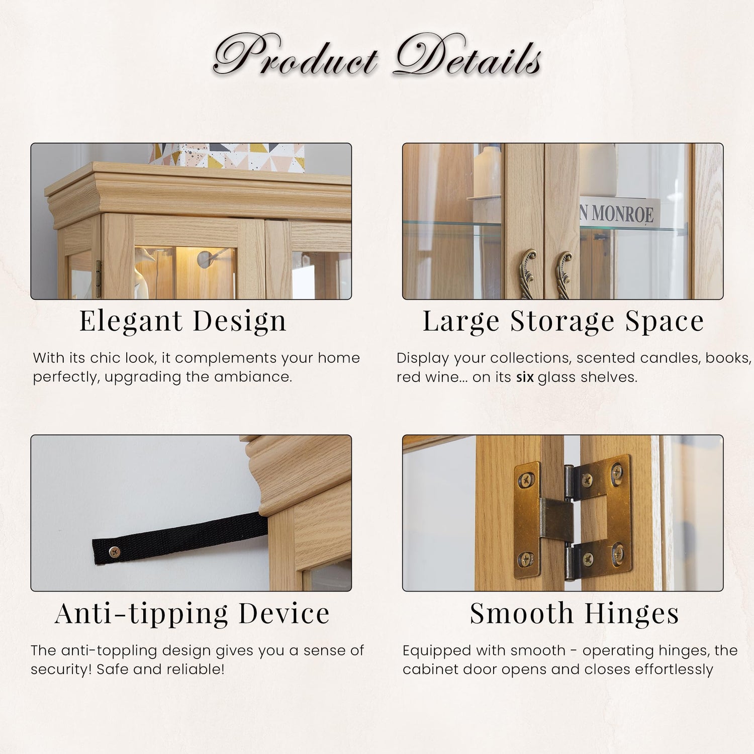 CKEASEAN Curio Cabinet 71" Lighted Glass Display Case, Wooden Wine Bar Cabinet with 6 Adjustable Shelves, Tempered Glass Doors, Light Bulb Included, Rack for Living Room Liquor Storage (Light Oak)