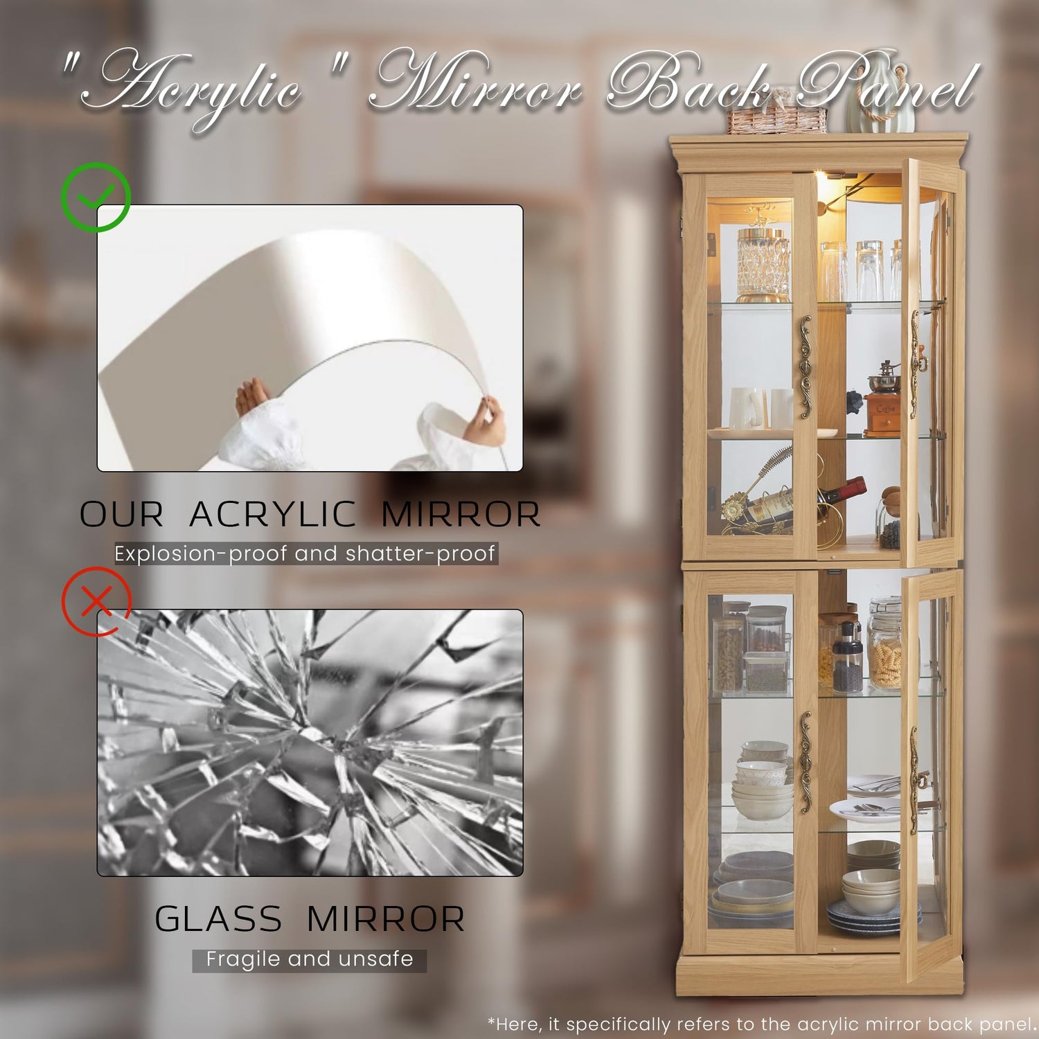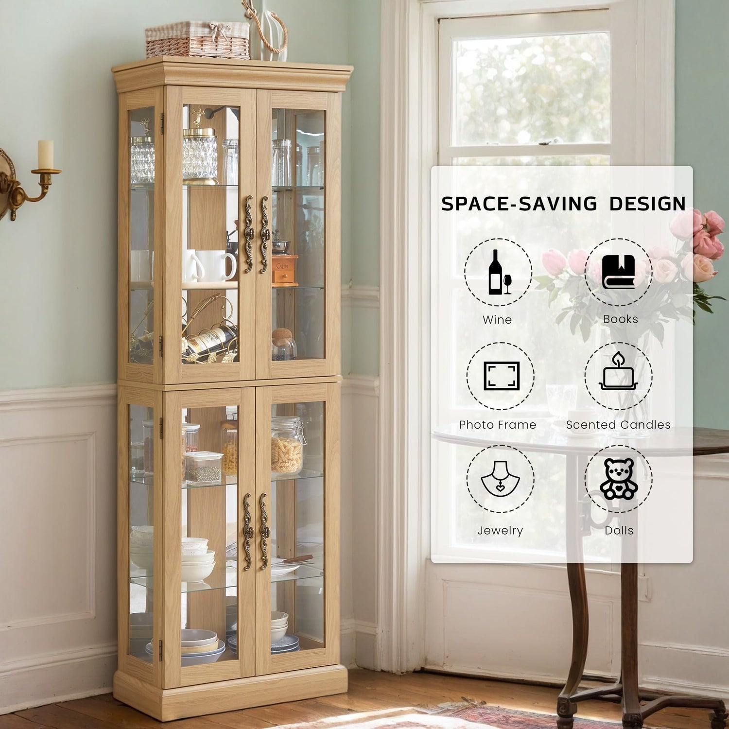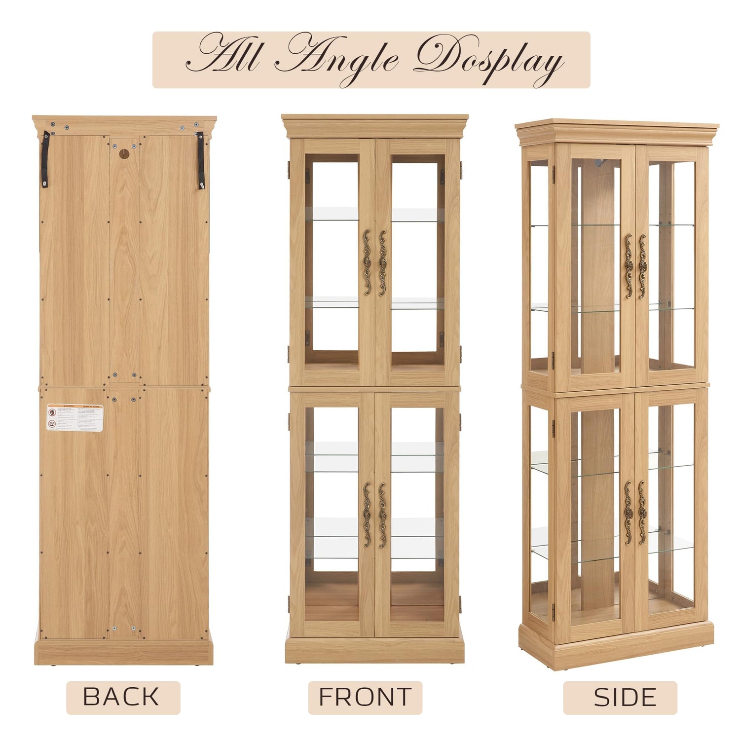 CKEASEAN Curio Cabinet 71" Lighted Glass Display Case, Wooden Wine Bar Cabinet with 6 Adjustable Shelves, Tempered Glass Doors, Light Bulb Included, Rack for Living Room Liquor Storage (Light Oak)