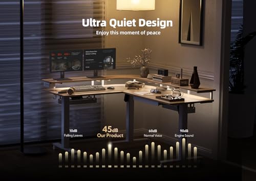 - More Powerful Motor: The l shaped standing desk with led lights are equipped with dual powerful motor, allowing smooth height adjustment between 28.3" to 47.2" at a speed of 1"/second with low noise. There 4 memory buttons can save your ideal positions and go from your perfect sit to stand with one-touch.