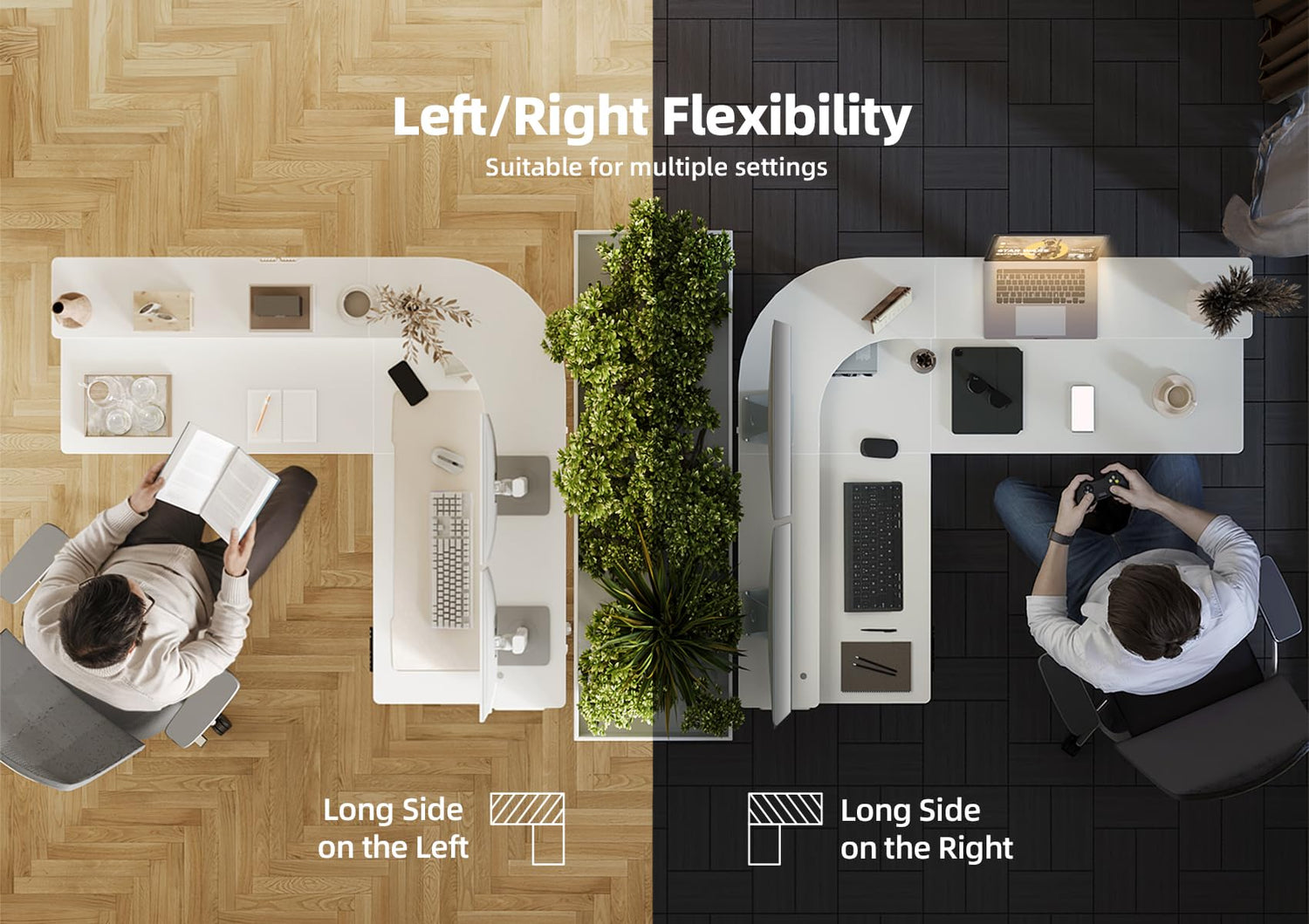 - Reversible L-Shaped Design: The large L shaped standing desk with drawers is perfect for any corner of your home or office. You can assemble it with the longer side on the left or right, depending on your space and preference. Its sleek, modern design seamlessly complements a variety of home and office settings.