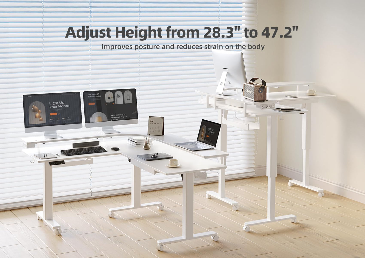 - More Powerful Motor: The l shaped standing desk with led lights are equipped with dual powerful motor, allowing smooth height adjustment between 28.3" to 47.2" at a speed of 1"/second with low noise. There 4 memory buttons can save your ideal positions and go from your perfect sit to stand with one-touch.