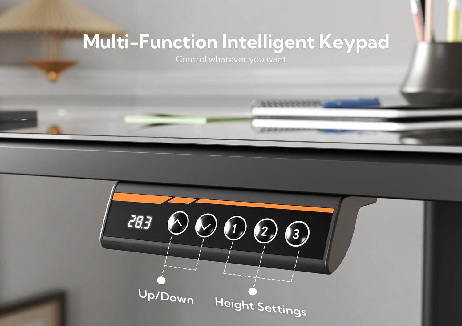 - Electric Height Adjustment: Our electric standing desk is equipped with a robust motor that smoothly adjusts the height from 28.3 inches to 46.5 inches (including the 2.36-inch desktop thickness) with 3 programmable height presets for quick and easy adjustment to your preferred height, catering to your needs
