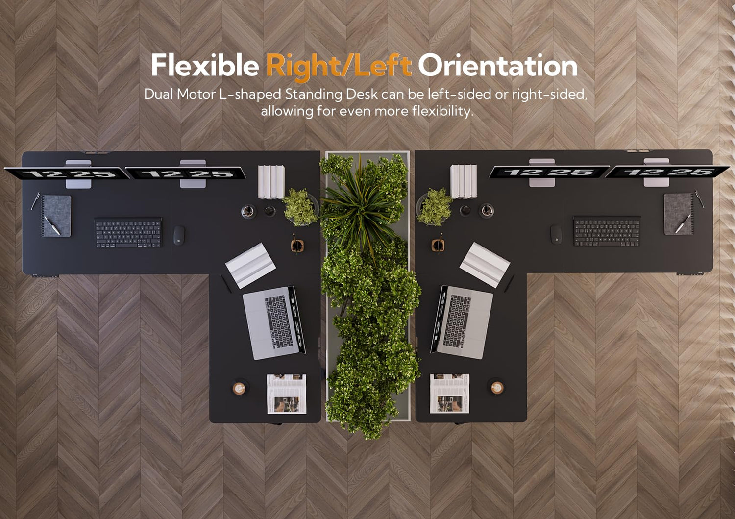- Large workspace - This L shaped standing desk is designed to fit perfectly in different spaces, providing extra workspace with 63x55 inch tabletop and flexible right/left orientation for all your needs.