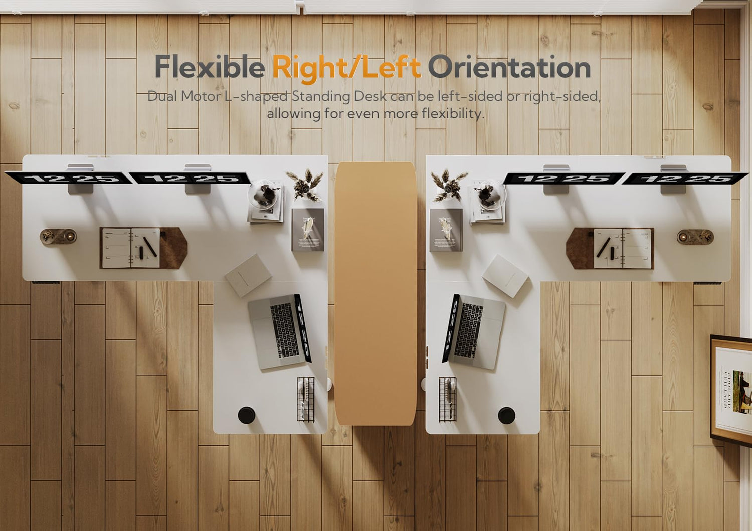 - Large workspace - This L shaped standing desk is designed to fit perfectly in different spaces, providing extra workspace with 63x55 inch tabletop and flexible right/left orientation for all your needs.