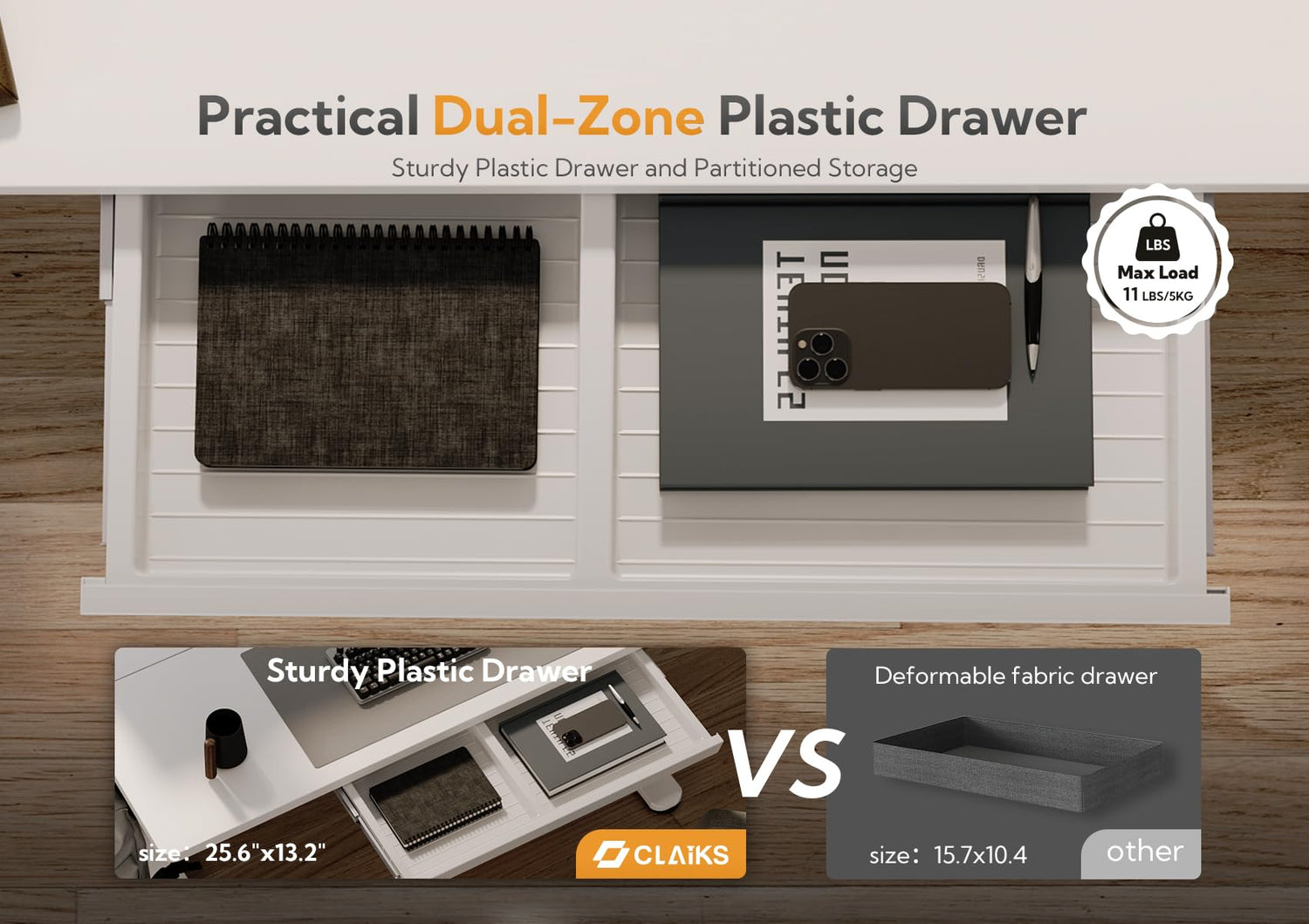 - Bigger and more stable plastic drawer - The large size plastic drawers, measuring 25.6"×11.8", help you organize more desktop items. The unique drawer slide design makes the drawers more stable and durable, recommended maximum load capacity is 4.4 lbs.