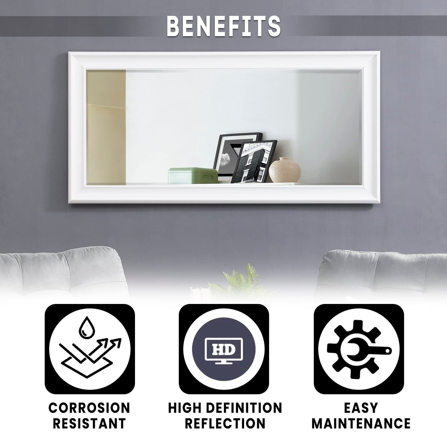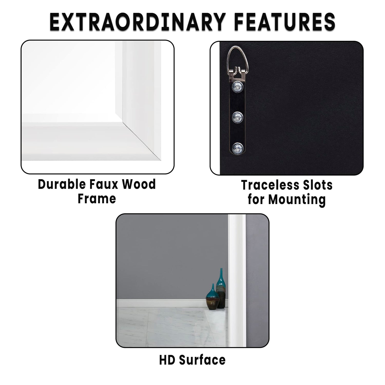 - ELEGANT FULL VIEW MIRROR: Our classy wall mirror provides a complete view of your outfit in one glance. This white wood mirror full length is eco-friendly, featuring a copper-less white coating to prevent rust. Whether used as a standing mirror or floor mirror full length, it enhances your decor. The full length mirror with stand is ideal for any space, offering versatility as both a mounted or leaning floor & full length mirror in your living room or bedroom.