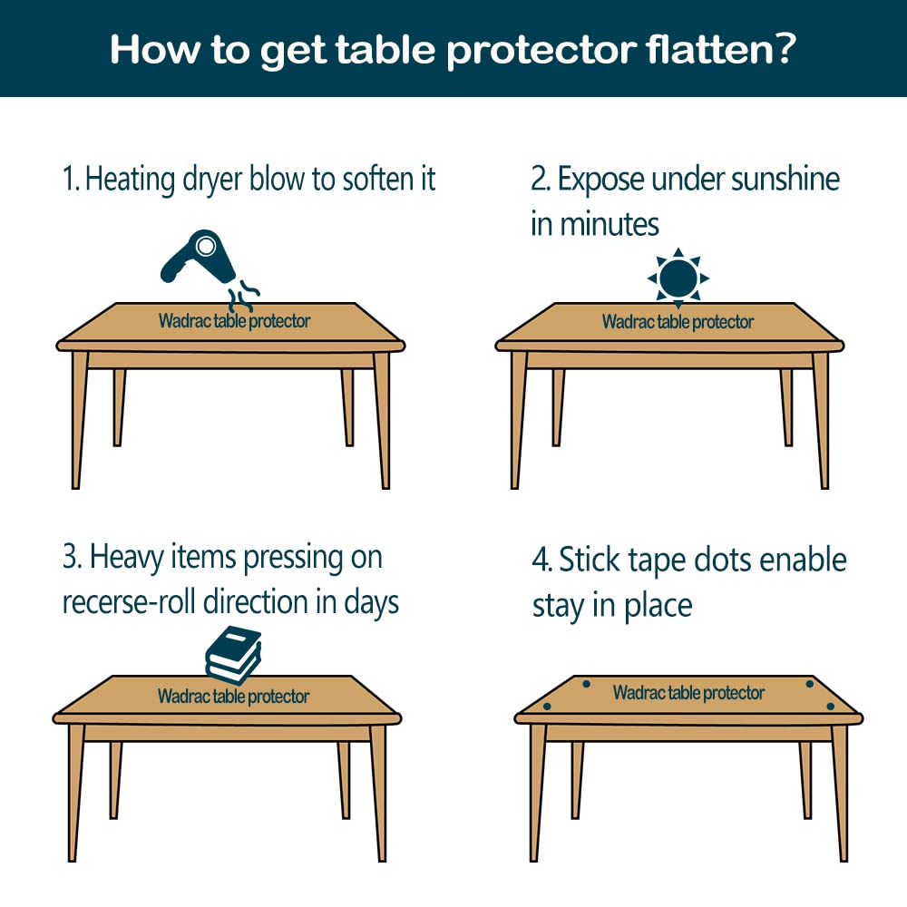 - Warm Tips:How to make Vinyl Tablecloth Flat?1. Use hair dryer heating it after lay; 2. Lay out the PVC table protector in Reverse-Roll direction, use heavy duty items pressing on it in days; 3. Steep in hot water or expose under sunshine in minutes;or stick double-sided tape dots between table and the vinyl table protector,Heat Resistant transparent table cloths,(maximum to 81 Centigrade, or 176 Fahrenheit),Water Resistant furniture table topper protector,easy clean table runner