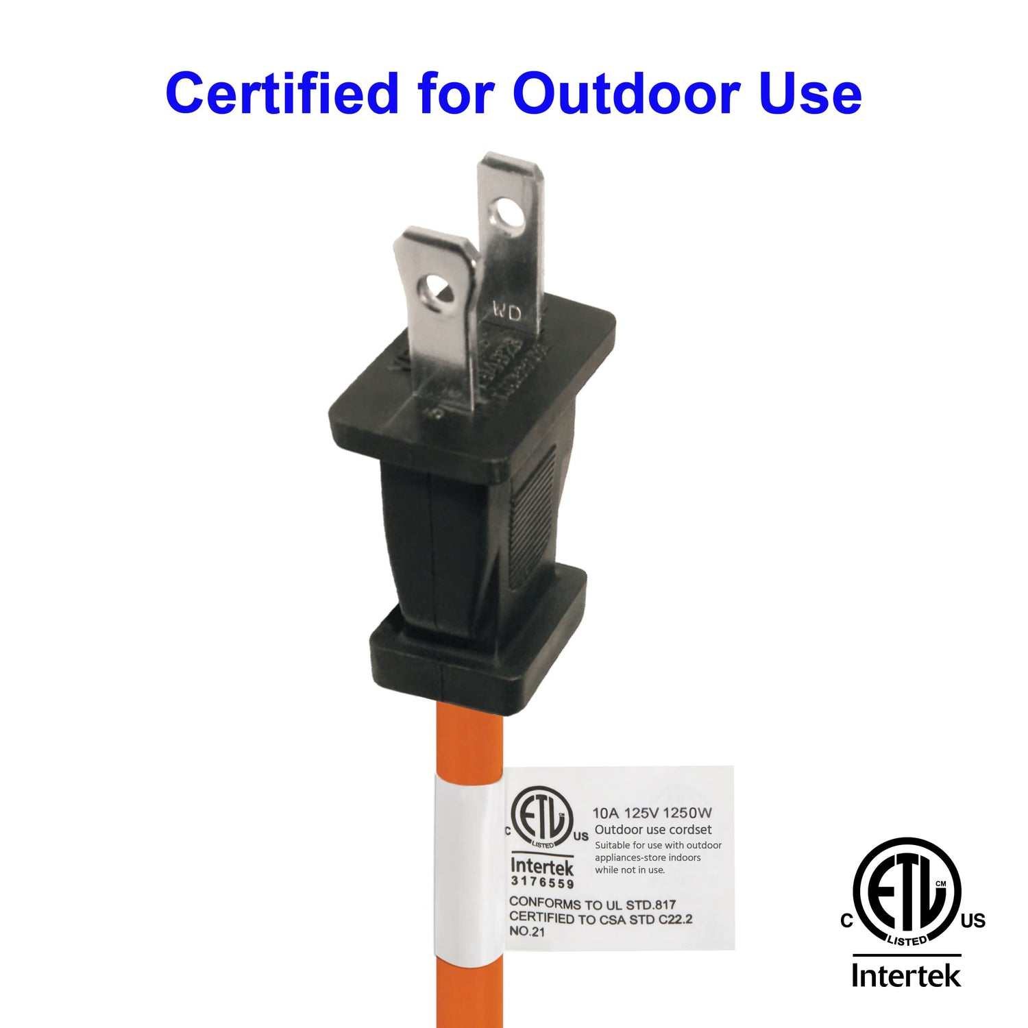 - SAFETY: This ETL certified outdoor rated extension cord features 100% pure copper conductors and is rated up to 10 amps/1625 watts at 125 VAC. Agency tested and certified for outdoor use in the USA & Canada.