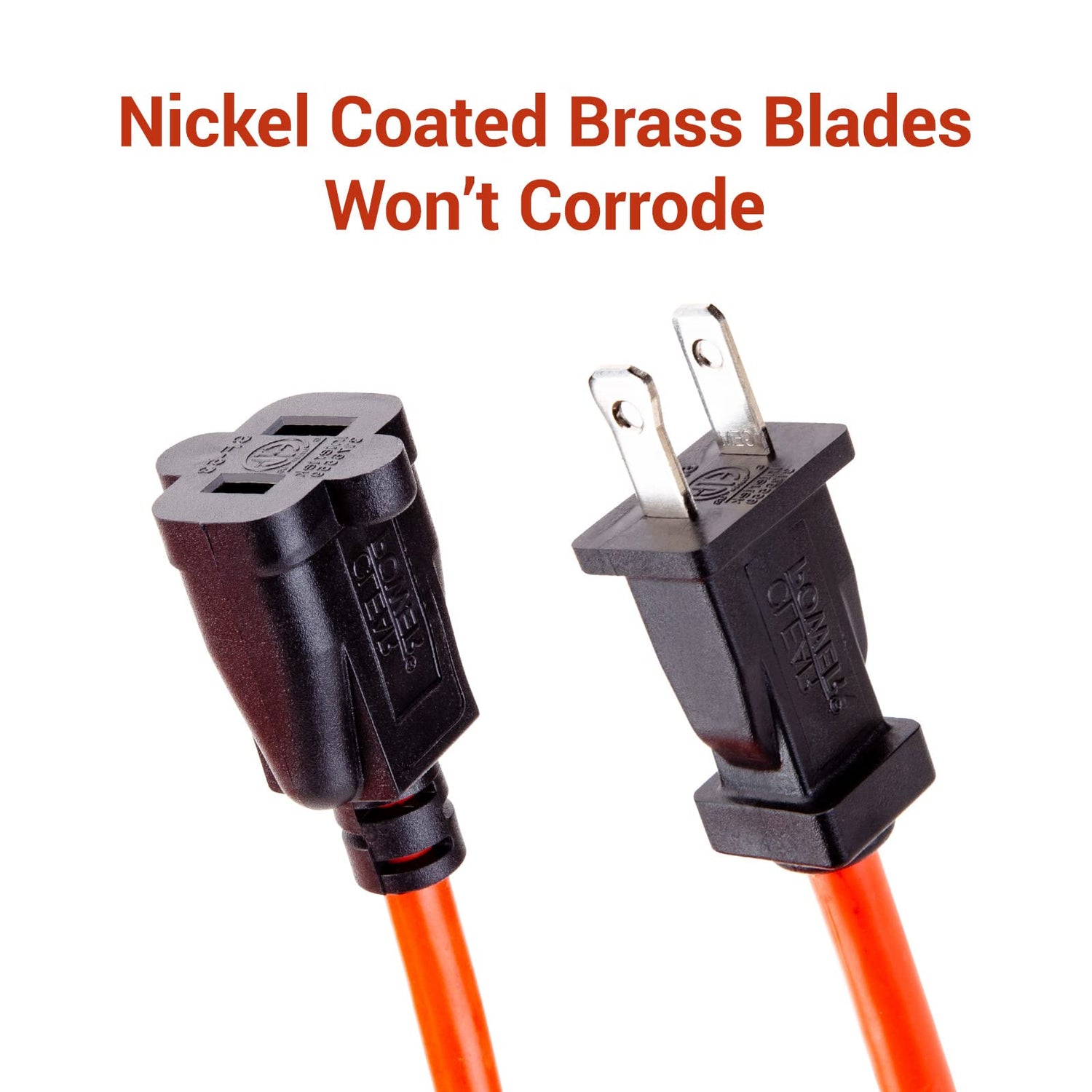 - DURABLE: This outdoor rated extension cord is water and abrasion resistant and features a flame retardant SJTW jacket. Works in temperatures from -40°F up to +140°F. Nickel coated brass blades won't corrode which helps prevent arcing.