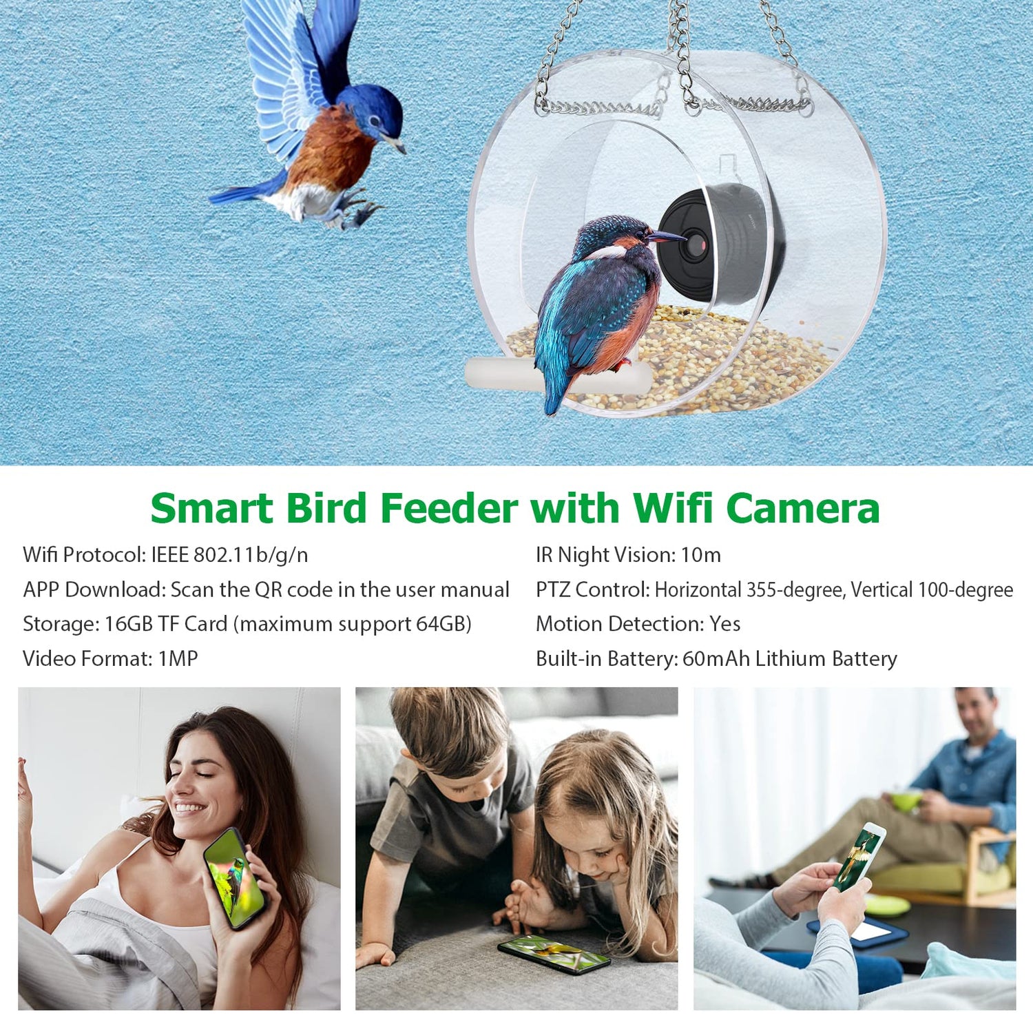 Clear Window Bird Feeder with Wifi Camera Suction Cup, Smart Transparent Round Birdfeeder with 16GB TF Card Photo Taking Video Recording IR Night Vision, Outside Birdhouse for Close Up View Outdoors