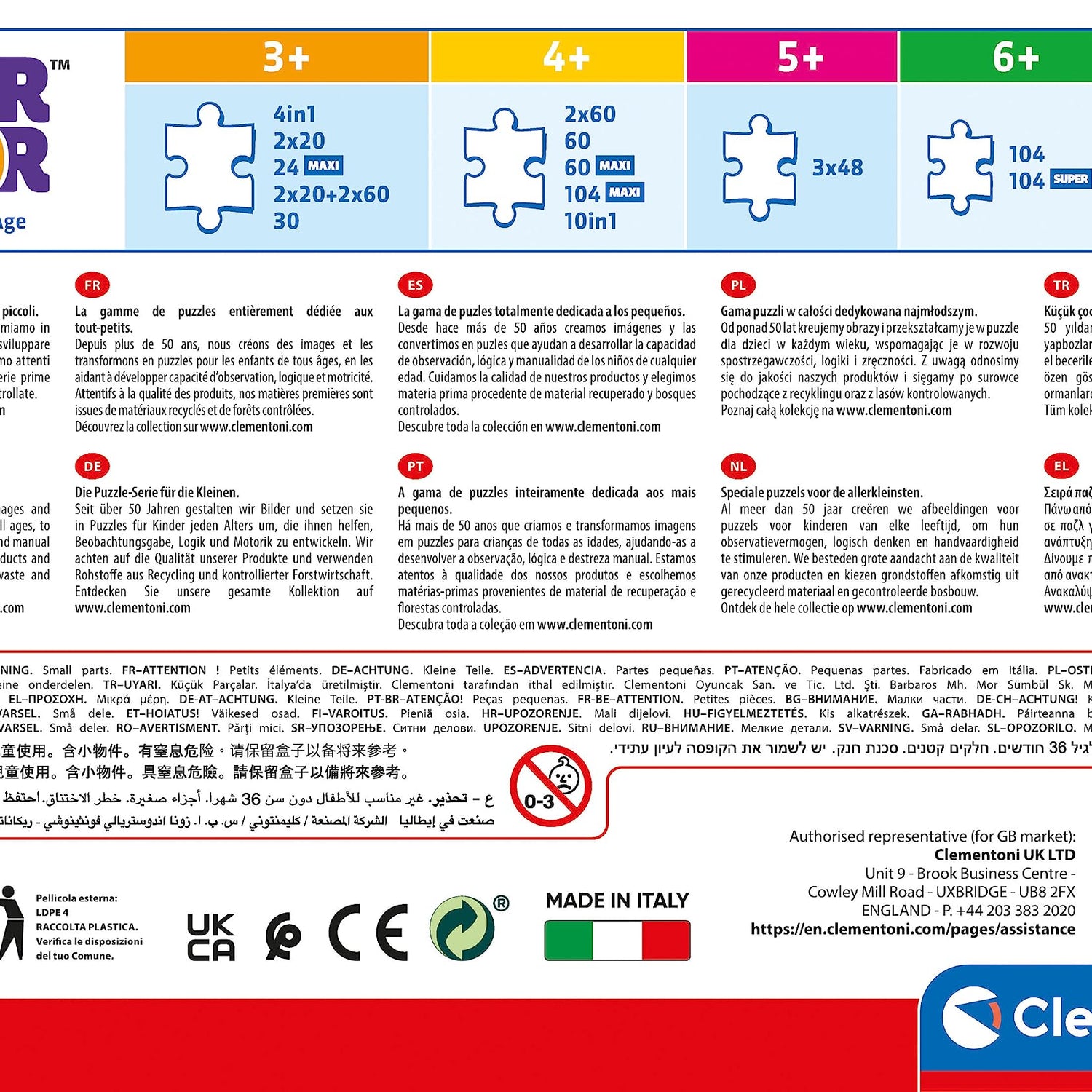 - Clementoni offers the added benefit of the after-sales assistance service for lost pieces. Made in Italy.