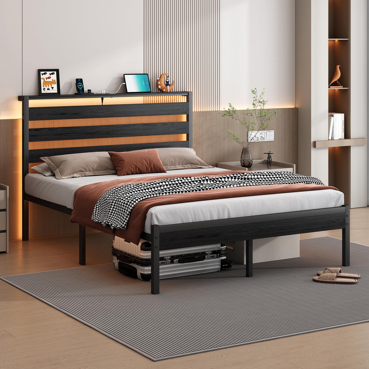 CLIBFENG 14 Inch Classic Metal Platform Bed Frame-Queen Bed Frame with Headboard,Steel Slats Support-LED Bed Frame with USB Charging Station,Under Bed Storage,No Box Spring Needed,Noise Free