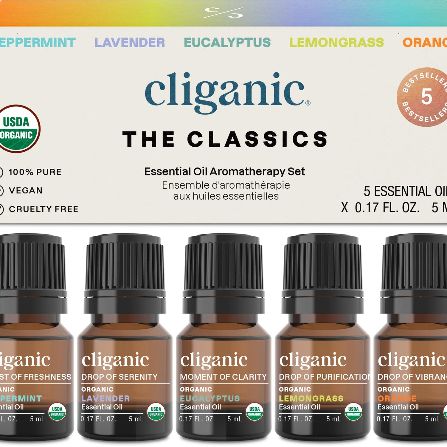 Cliganic Organic Essential Oils Set (Top 5 - The Classics) - 100% Pure Natural - Aromatherapy, Candle Making - Peppermint, Lavender, Eucalyptus, Lemongrass & Orange (Packaging May Vary)