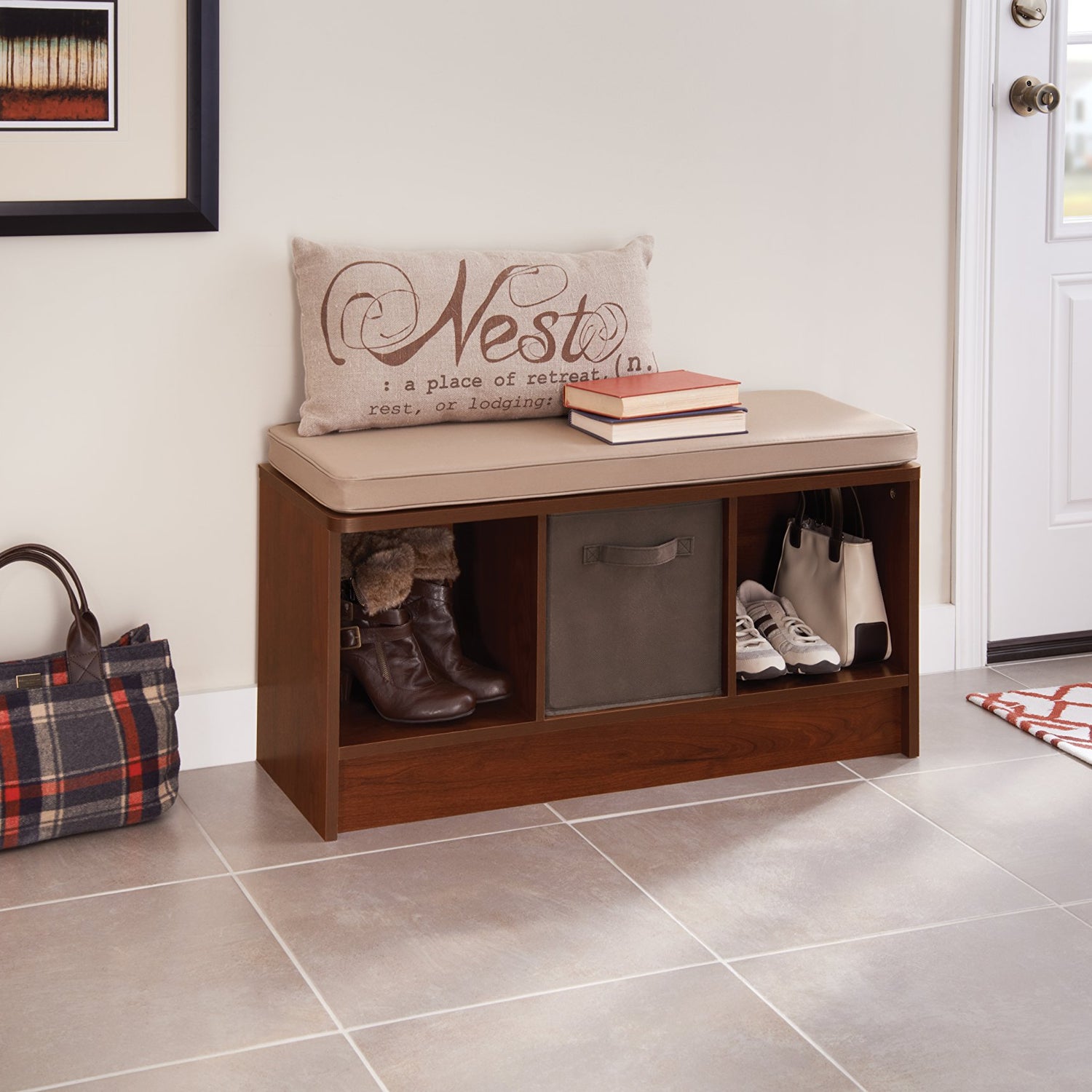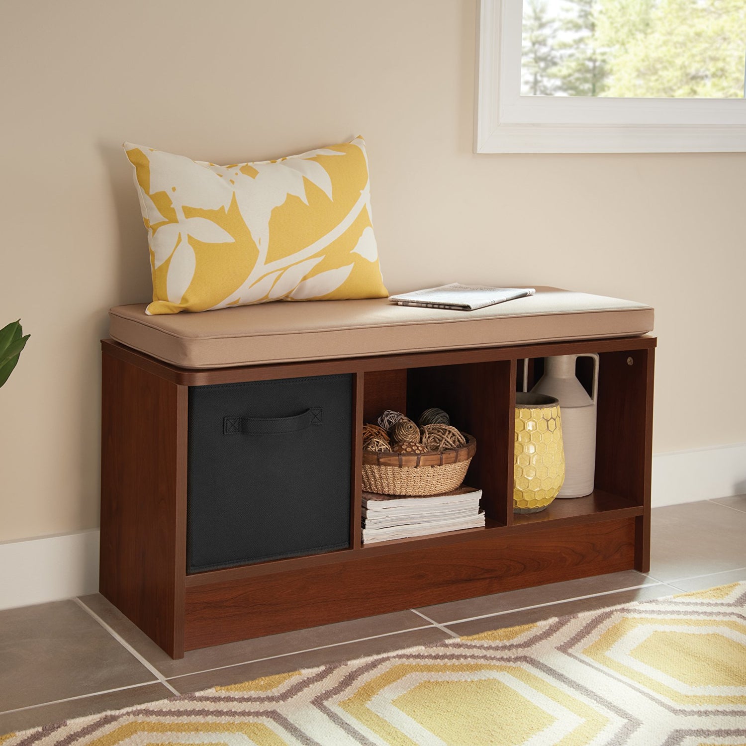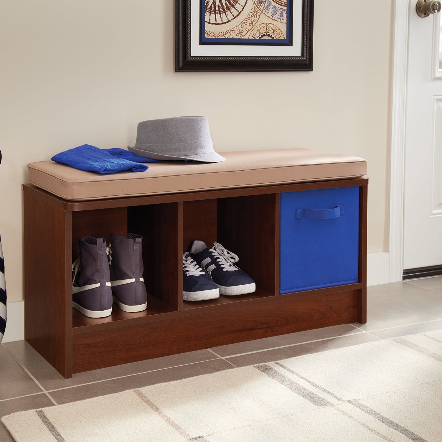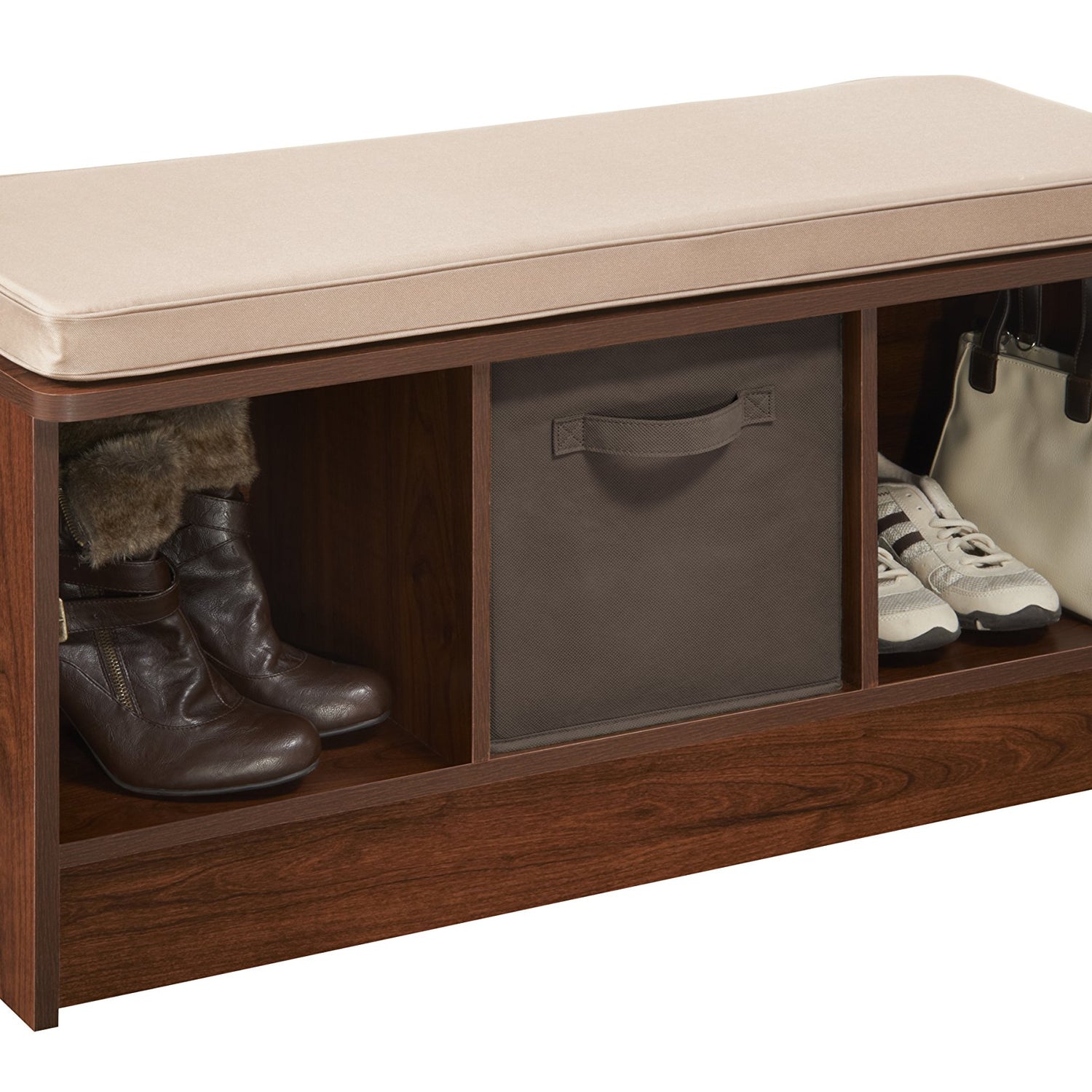 Details: Organize your entryway or mudroom with the dark Cherry ClosetMaid 3-cube bench. Its cubbies are designed to hold ClosetMaid fabric drawers (not included) to provide storage for shoes, hats and other things you might want to keep by the doorway. The top of this 3-cube storage bench has a comfortable cushion that makes it an ideal seating area. Some assembly required.