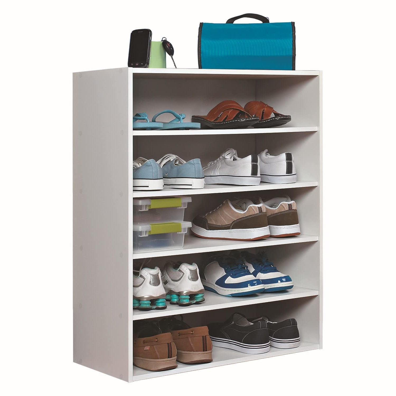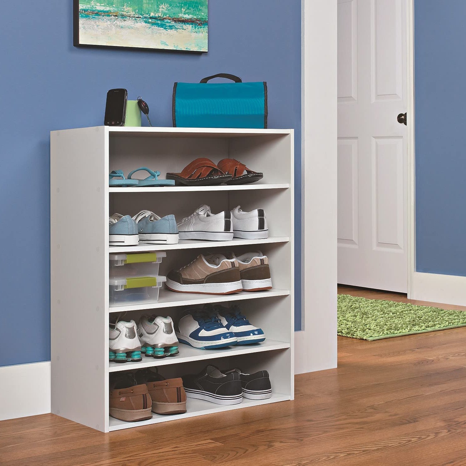 Details: The ClosetMaid 10-pair stackable shoe rack is a simple, yet convenient storage solution, perfect not only for organizing shoes, but hobbies, media, and office supplies, as well. Featuring five spacious shelves, a full backer, and the ability to stack multiple units, this shoe rack takes your organization to the next level. Crafted from sturdy laminate, this rack is perfect for even the most high traffic areas of the home, serving as a drop station in an entryway or mudroom or custom storage in closets, living areas, and home offices.