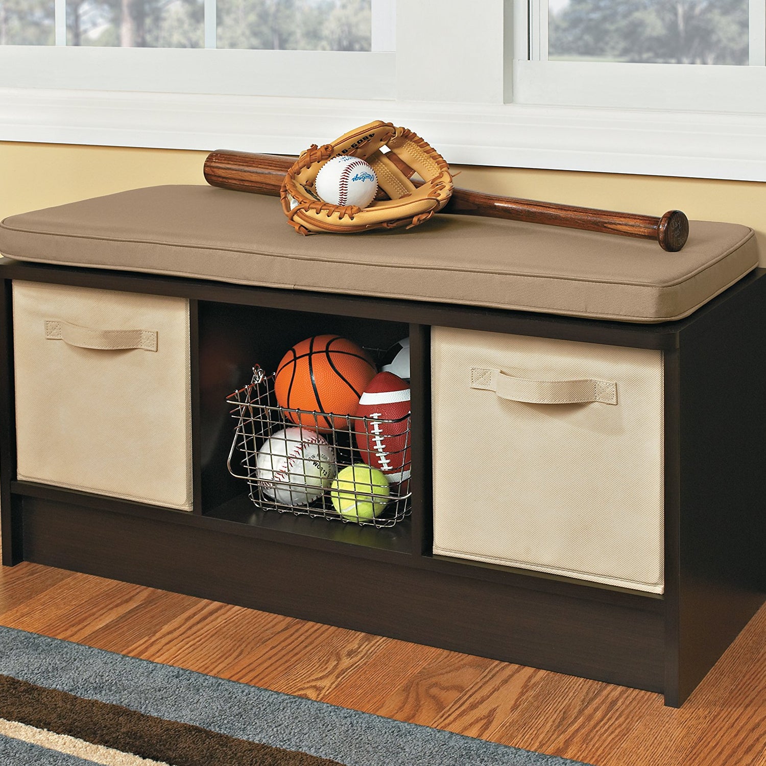 Details: Organize your entryway or mudroom with the espresso Closet Maid 3-cube bench. Its cubbies are designed to hold Closet Maid fabric drawers (not included) to provide storage for shoes, hats and other things you might want to keep by the doorway. The top of this 3-cube storage bench has a comfortable cushion that makes it an ideal seating area. Some assembly required.