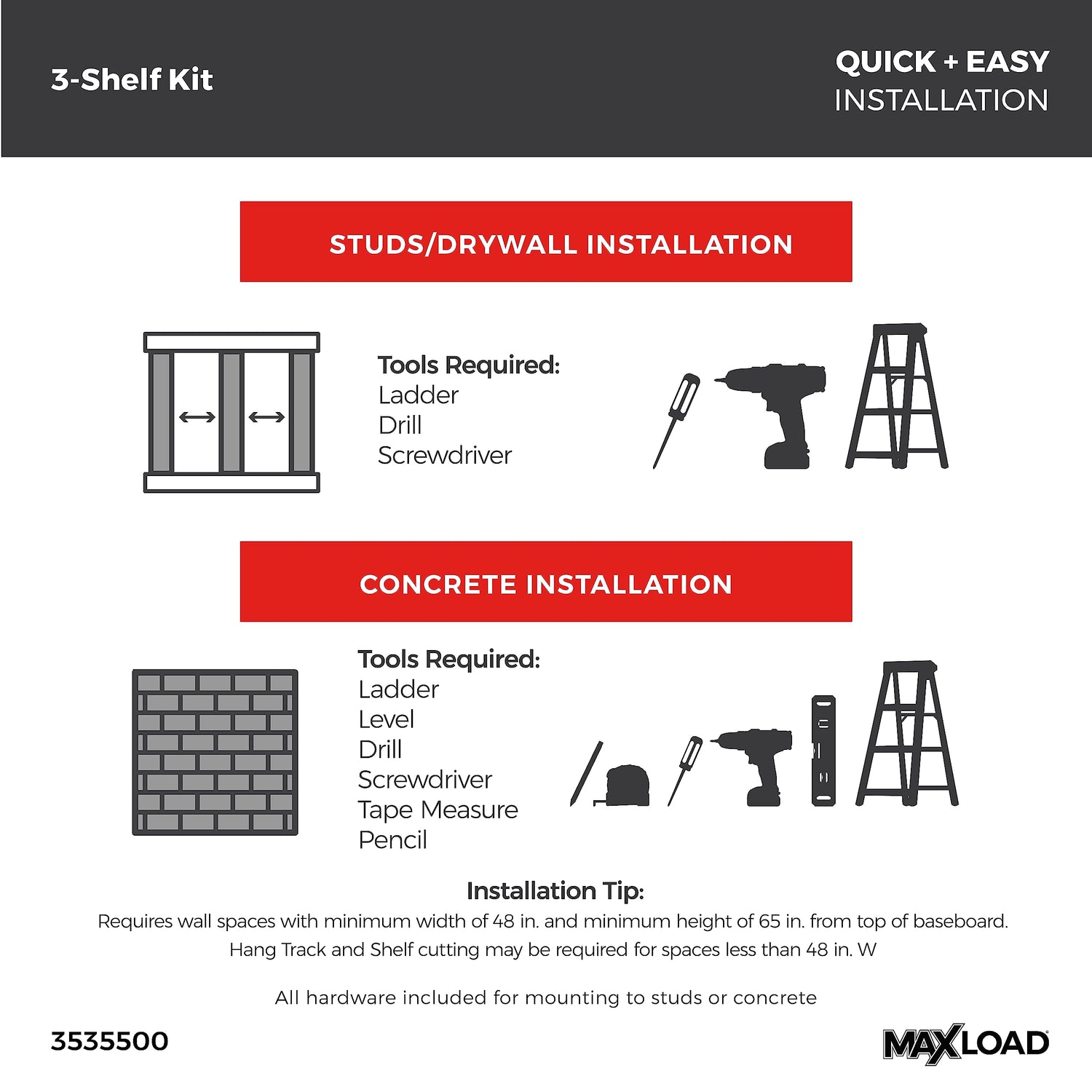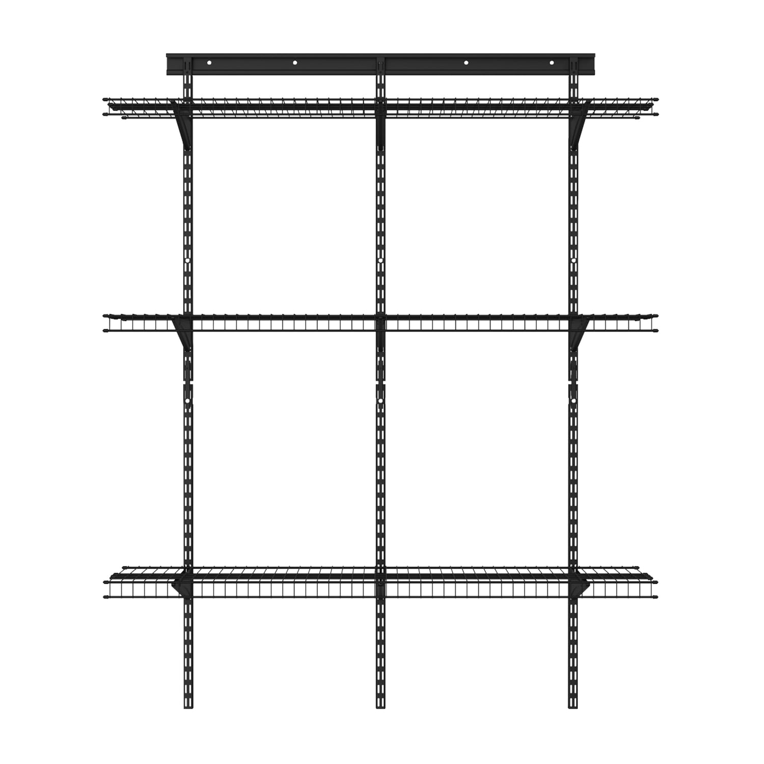 Details: Upgrade your garage with this storage rack system from ClosetMaid’s MaxLoad collection. With three wire shelves made from durable epoxy-coated steel in a bold black finish, this all-in-one shelving kit includes everything you need to add fully adjustable, ventilated shelving to your garage. Designed with the popular ClosetMaid ShelfTrack system, this storage shelf set is fully adjustable for your heaviest or tallest items! Use in your garage or utility room for storage totes, home improvement supplies, power tools, automotive gear, lawn equipment & more. The adjustable shelves can be adjusted periodically to fit items of various heights. The durable black wire shelving is strong and ventilated for humid conditions in garage or shed spaces. Heavy duty shelving features strong weight capacities so you can organize your space without concern when easily installing per manufacturer’s instructions. Everything is included with this MaxLoad 3-Shelf set to make organizing your garage even easier! Get organized with MaxLoad by ClosetMaid.