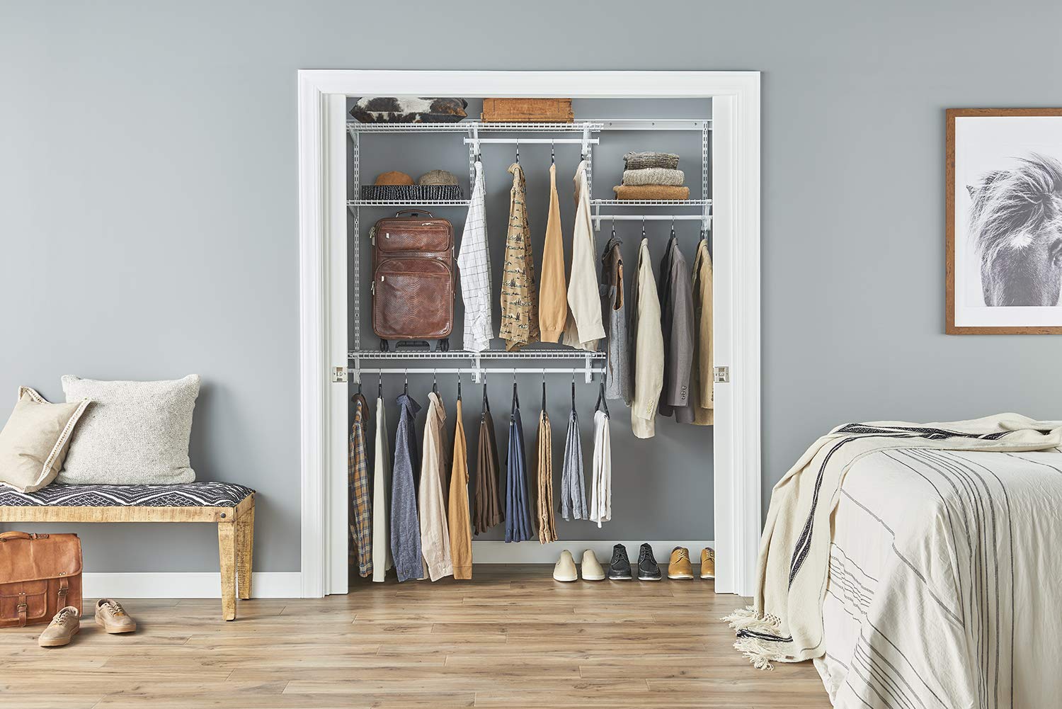 - CLOSET ORGANIZER SYSTEM: All in one wire closet shelves kit that creates up to 96 in. of hanging space and 144 in. of shelf space; Kit includes hang track, standards, shelf brackets, closet rods, closet rod support and SuperSlide shelves