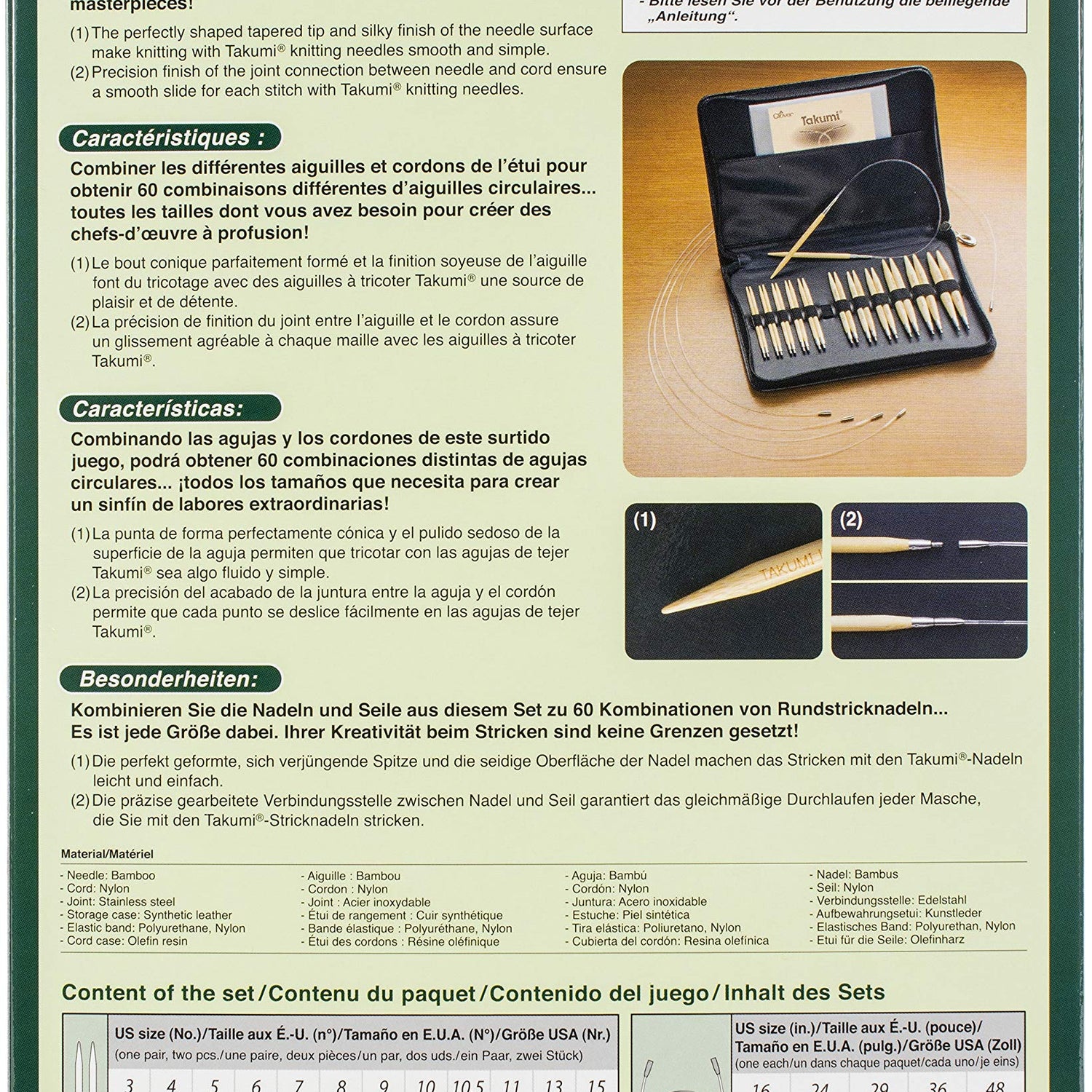Details: Combine the assorted needles and cords in this set to create up to 60 possible combinations of circular knitting needles...all the sizes you need to create a wealth of knitting masterpieces! The perfectly shaped tip and silky finish of these high quality bamboo needles make knitting with Takumi smooth and simple. The precision finish of the joint connection between the needle and cord ensure a smooth slide for each stitch no matter the material. This 7x11x1 inch package contains 12 needles in US sizes 3/3.25mm, 4/3.5mm, 5/3.75mm, 6/4mm, 7/4.5mm, 8/5mm, 9/5.5mm, 10/6mm, 10.5/6.5mm, 11/8mm, 13/9mm and 15/10mm and five cords (16 inch, 24 inch, 29 inch, 36 inch, and 48 inch) within one 9.75x6.5x1.25 inch exclusive zippered synthetic leather case. Imported.
