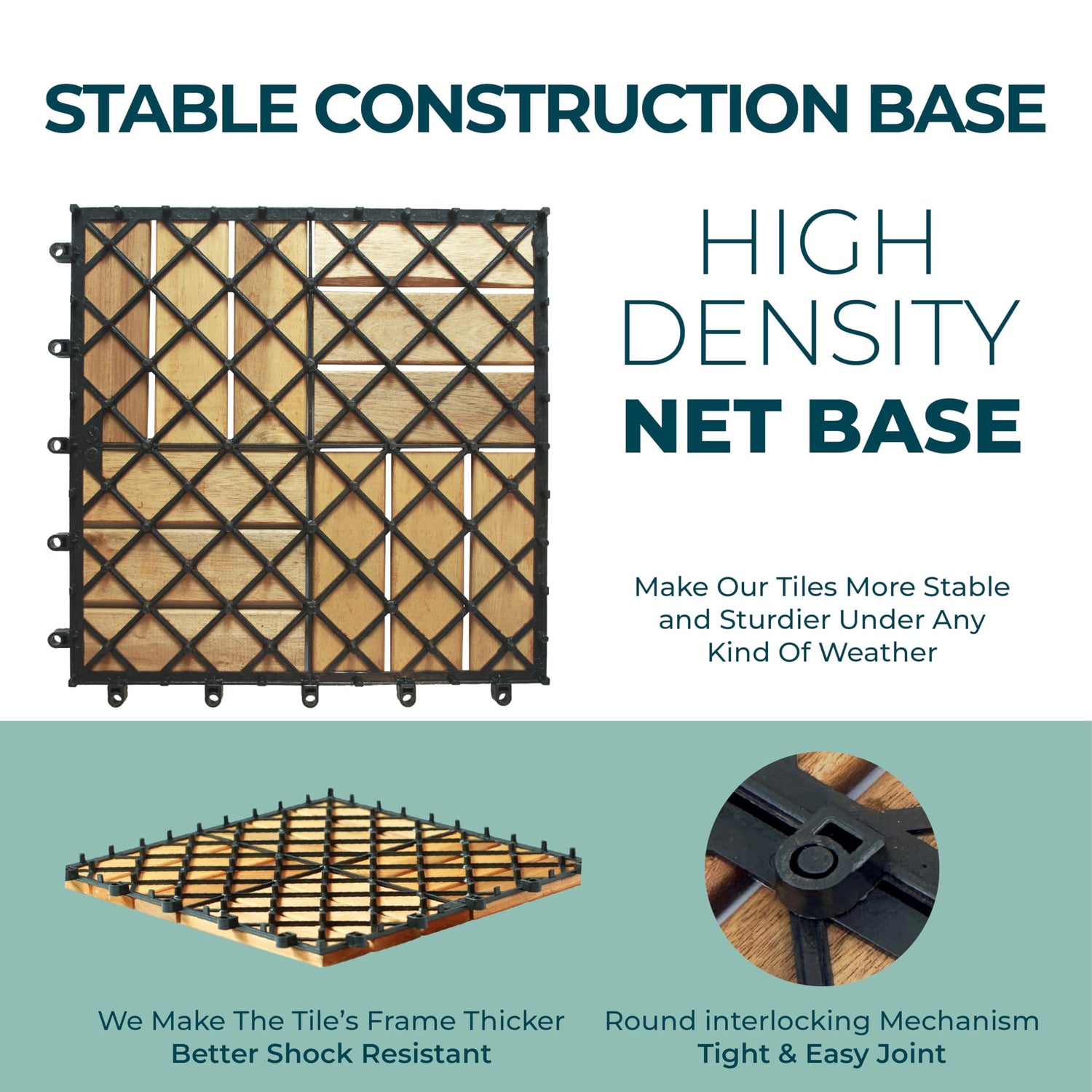 - WATERPROOF ALL WEATHER: Solid acacia wood tiles for floor, being pre-oiled in combination with high density of plastic net construction, ensure our decking tiles outdoor waterproof drain water quickly and can stand under any type of weather condition.