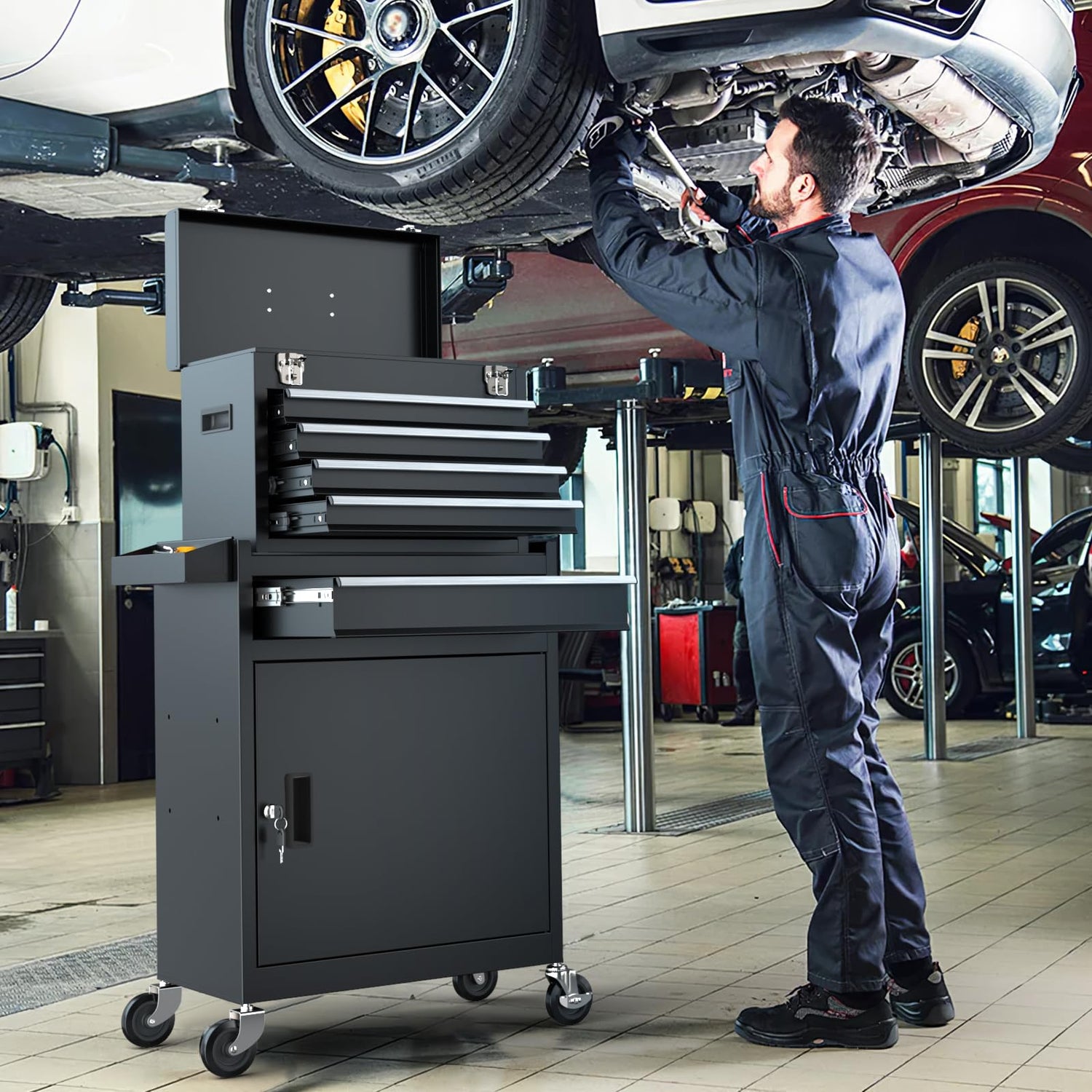 CMFYDAILY 5-Drawers Black Tool Chest, 2-in-1 Mechanic Rolling Tool Box Removable Lockable Tool Storage Cabinet, Metal Tool Cart with Drawers and Wheels for Garage, Workshop
