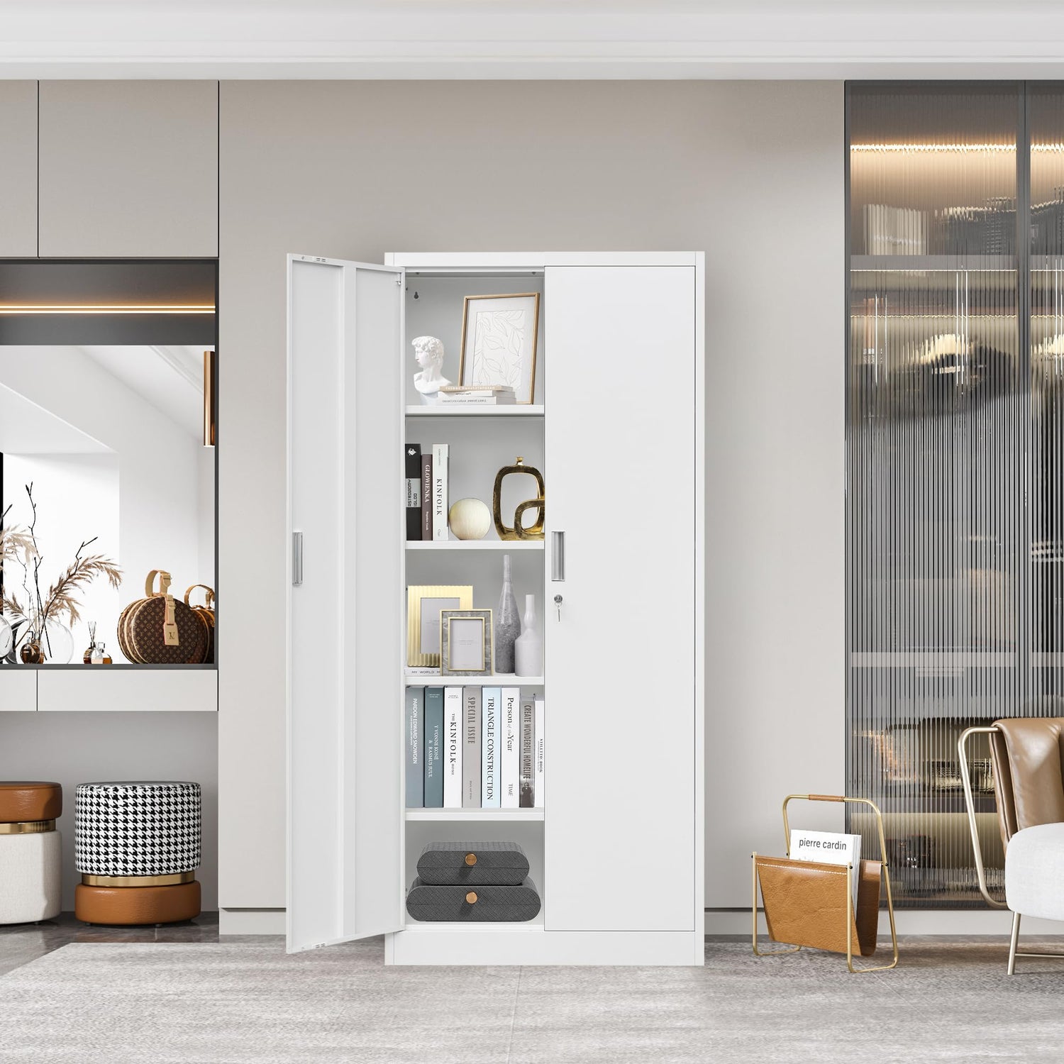 CMY Metal Storage Cabinet with Locking Doors and Adjustable Shelves, 72”H Steel Storage Cabinets for Garage, Home Office, Pantry (White)