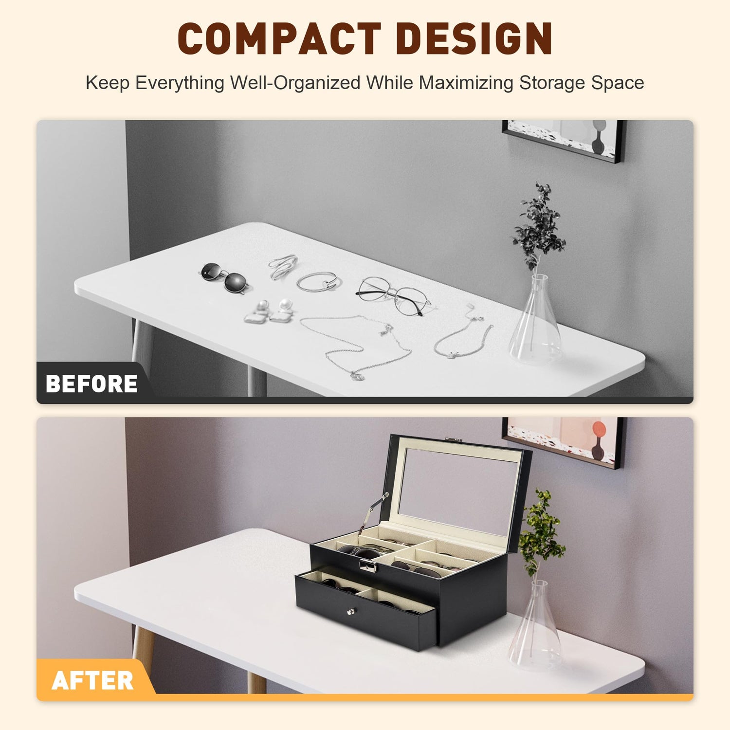 - Easier to Pick A Style ----- Transparent acrylic top allows you effortlessly to see through the box, making it super handy to pick a pair of glasses or watch to match your outfit