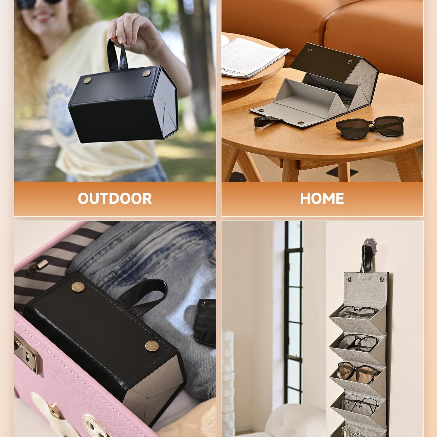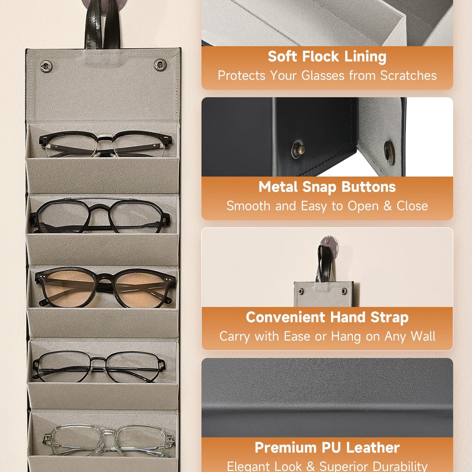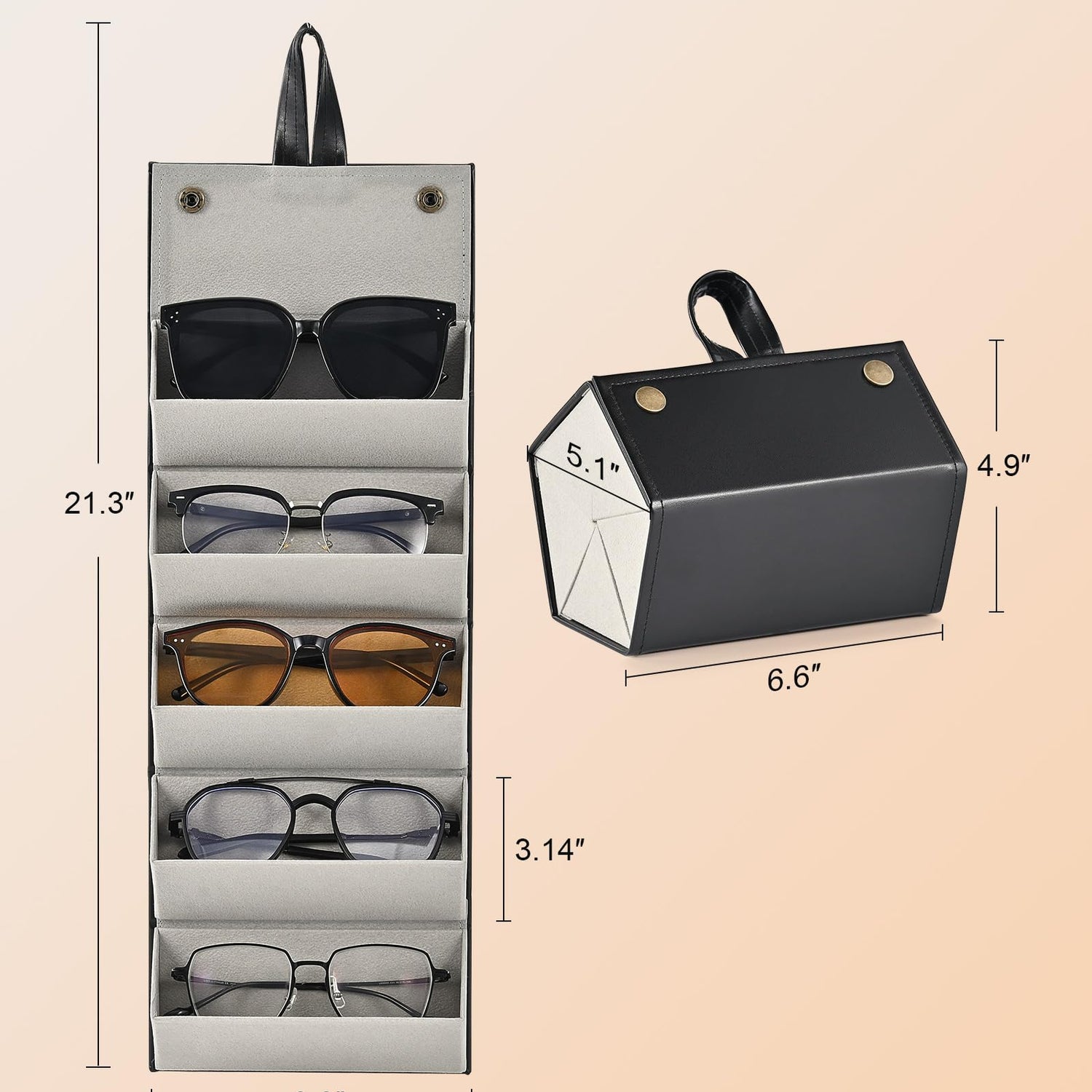- Space Saving: With a hanging strap atop, this sunglasses holder hangs effortlessly on any hook behind a door, in a closet, or on the wall. It's perfect for keeping your glasses organized in one place or elegantly displayed at home.