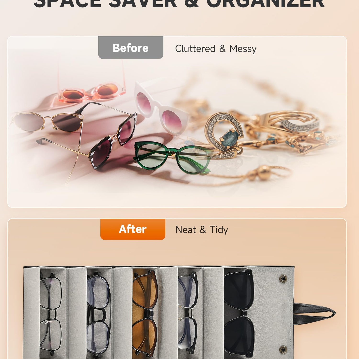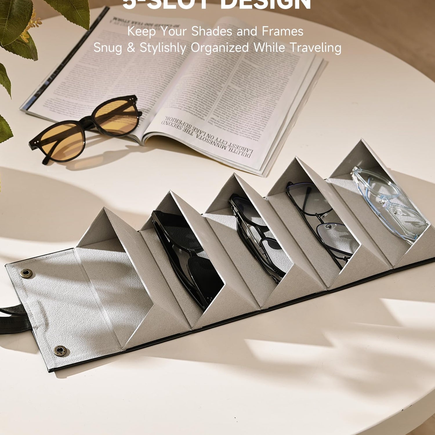 - Holds up to 5 Pairs: This roll-up glasses organizer features 5 slots to accommodate multiple pairs at once, allowing you to match different glasses to your outfit, mood, or occasion. Not just a sunglass organizer, it also conveniently holds your accessories on the go such as watches and jewelries.